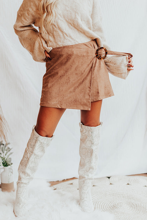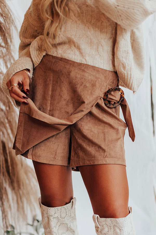 Add a boho flare to your fall wardrobe with these darling brown shorts featuring soft lightweight faux suede material, a side zip closure, a front overlay with an oversized circle tortoiseshell buckle belt, and a relaxed silhouette that falls into straight upper-thigh length hemlines! Measurements