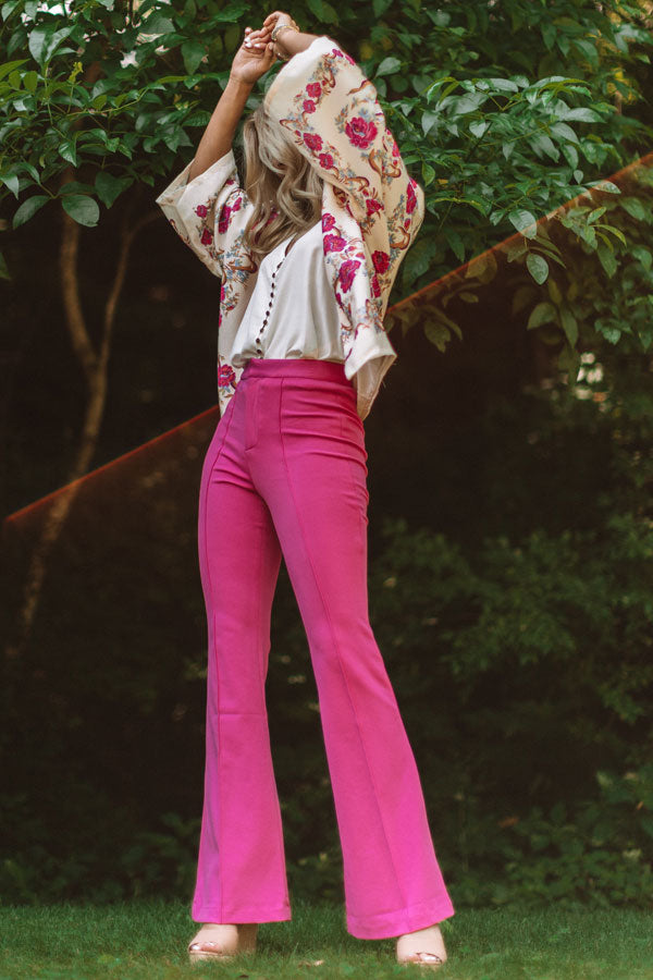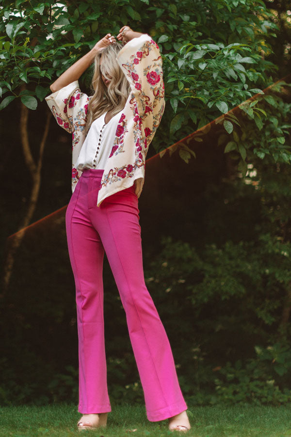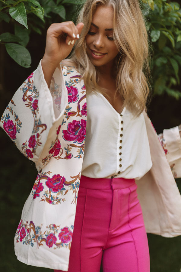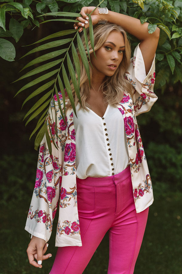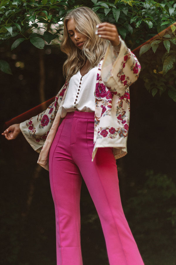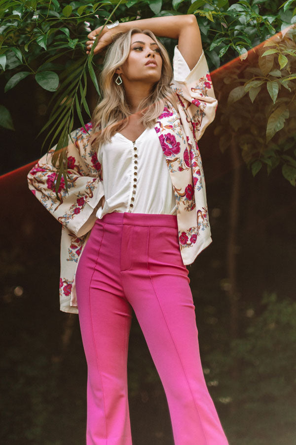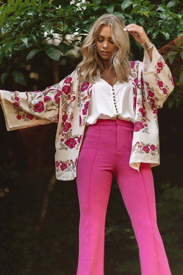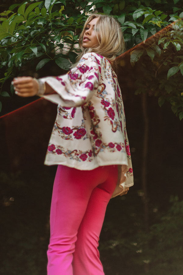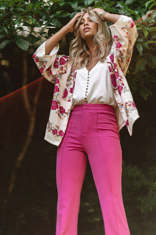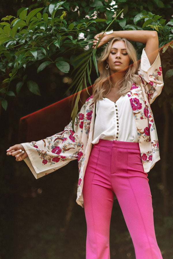 This blooming cardigan is for all you girl bosses out there who are chasing your dreams! It has a beautiful pink floral pattern, an open front, and flared sleeves that give it a chic kimono personality! Pair with a simple tank, neutral heels, and some statement trousers for the ultimate working girl outfit! Measurements