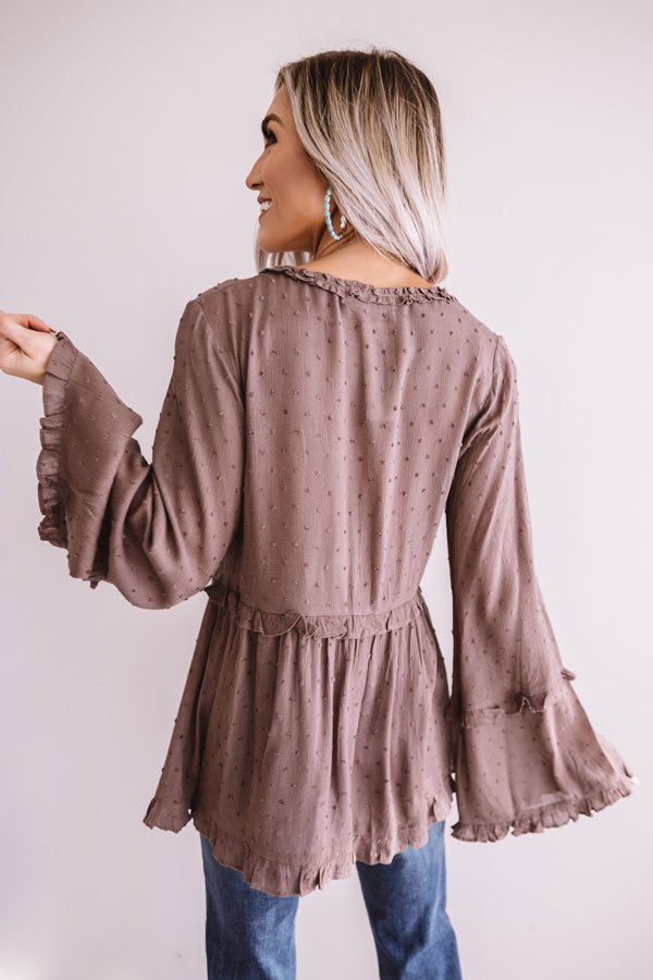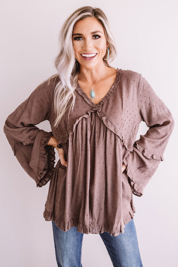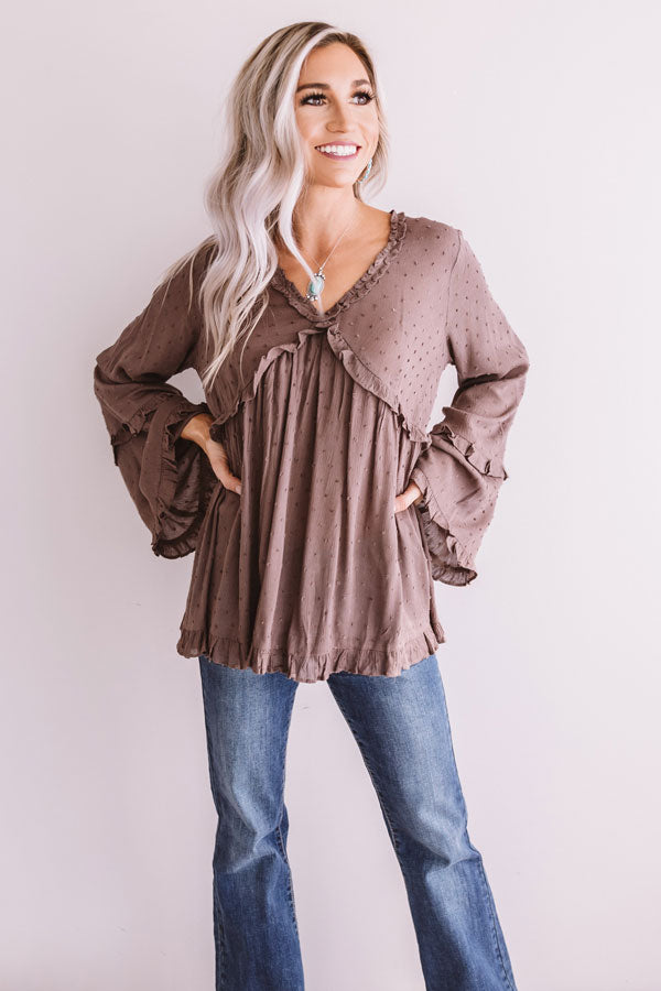 You will undoubtedly look like a brilliant bombshell when you wear this adorable espresso colored top featuring lightweight material with subtle polka dot texturing, ruffled trim and seam accents, a v-cut neckline, long loose sleeves with flared cuffs, and a relaxed babydoll silhouette that falls into a peplum bottom in the back with uneven tunic length hemline! We have styled this charming piece with some dark denim flares and a neutral bootie and fringe crossbody, but you can also wear it with some distressed light wash skinnies, "The Ophelia Wedge in Mocha," and our "Say It Ain't Soho Hat in Brown!" Measurements