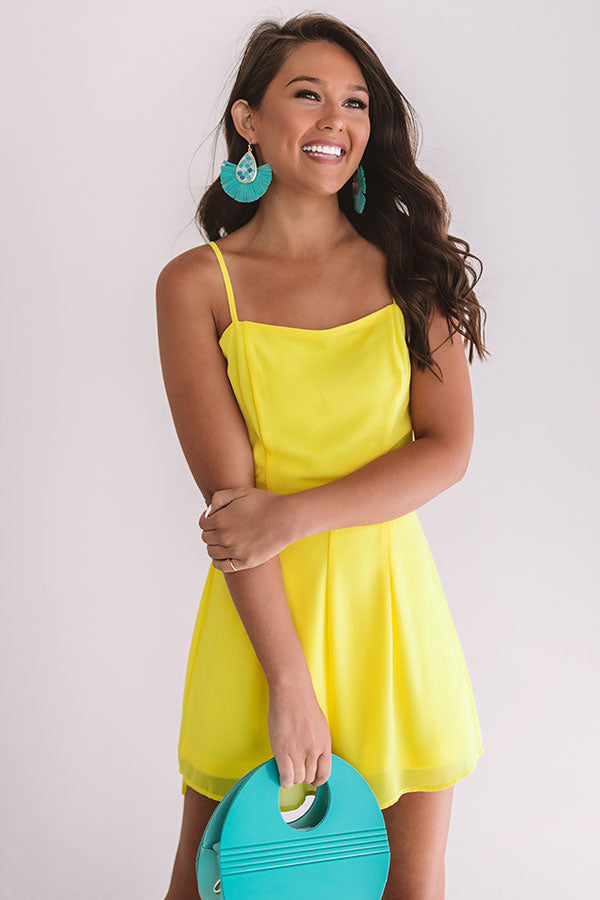 You will be saying bon voyage when you put on this yellow romper with its adjustable spaghetti straps and open back with a tie across the shoulders! Accessorize with a pair of strappy sandals and an adorable travel bag for the ultimate vacay babe look! Measurements