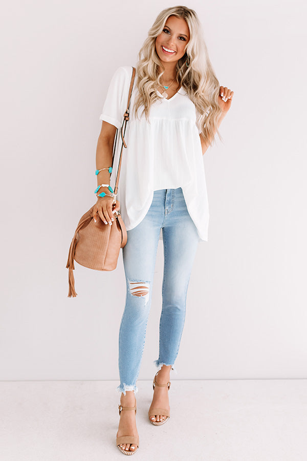 Make the world your runway in our upscale casual white "Bondi Bliss" top featuring lightweight material patterned with subtle canvas like texturing, a v-cut neckline and upper back with a tie closure, short loose sleeves with rolled cuffs, and an ultra relaxed babydoll silhouette that falls into an uneven hemline! We have styled this charming piece with some distressed ankle skinnies and neutral heels, but you can also wear it with some frayed black shorts, "The Lela Espadrille in White," our marigold "Flying Private Hair Scarf," and our "Sunny Situation Woven Tote in Marigold!" Measurements