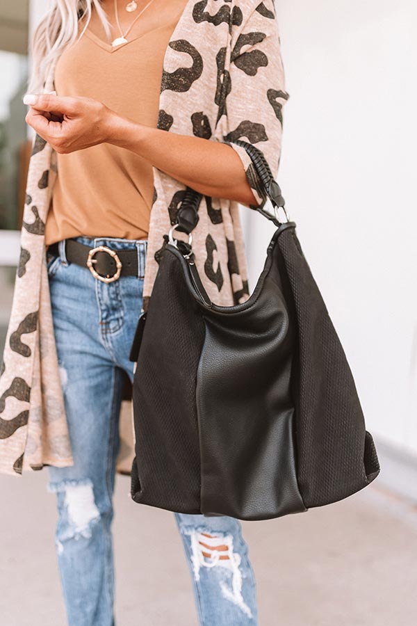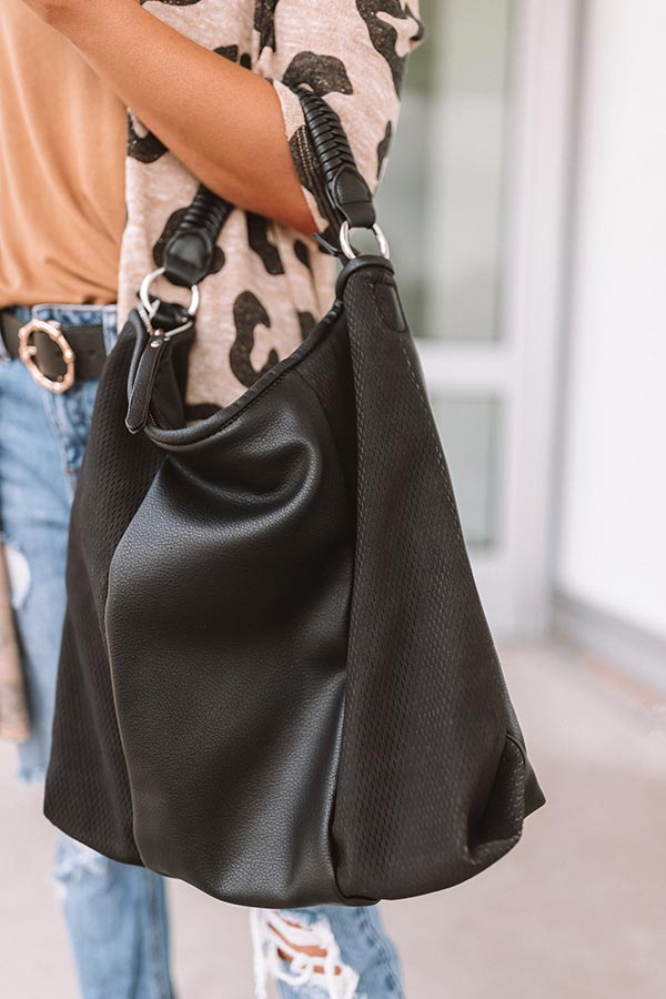 When "bonding over Bellinis" with your besties, there is no better accessory to show up in style with than this black tote featuring faux leather material and subtle textured panels, a braided handle, a large fully lined pouch with a zip closure and multiple inner pockets, and a removable and adjustable crossbody strap!
