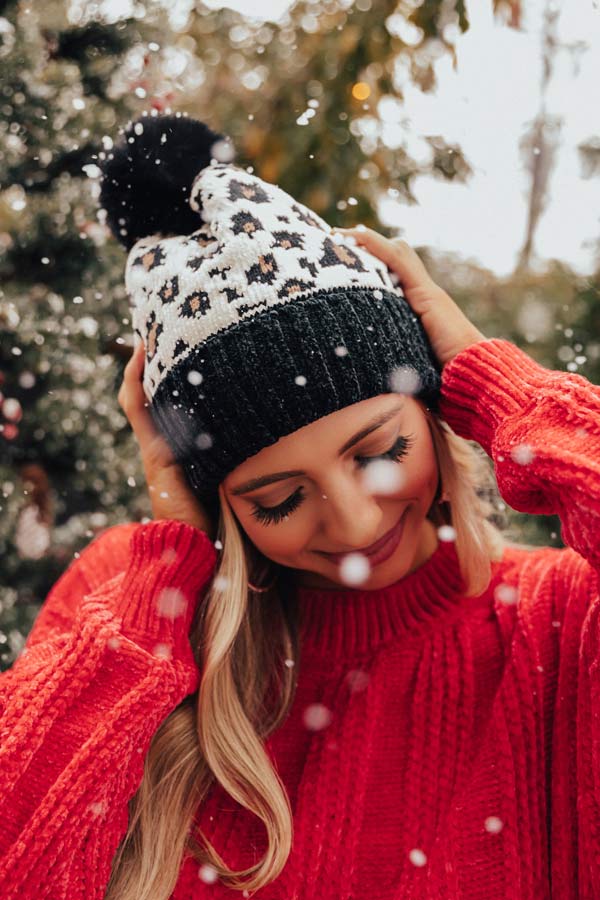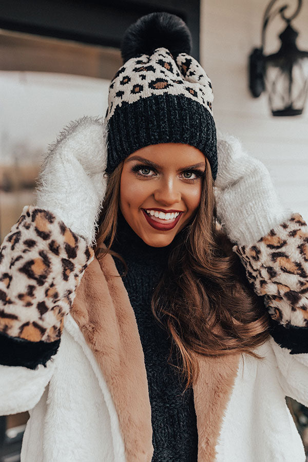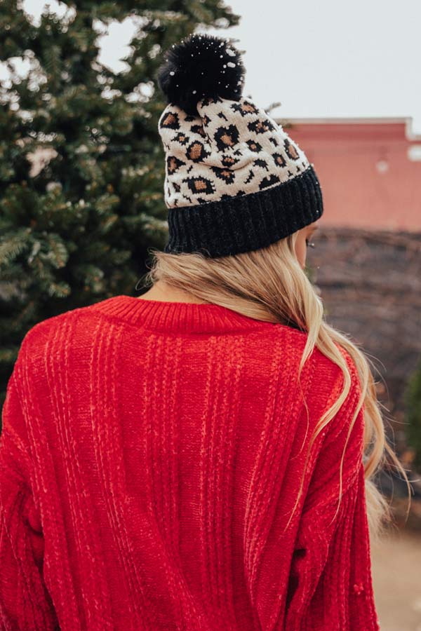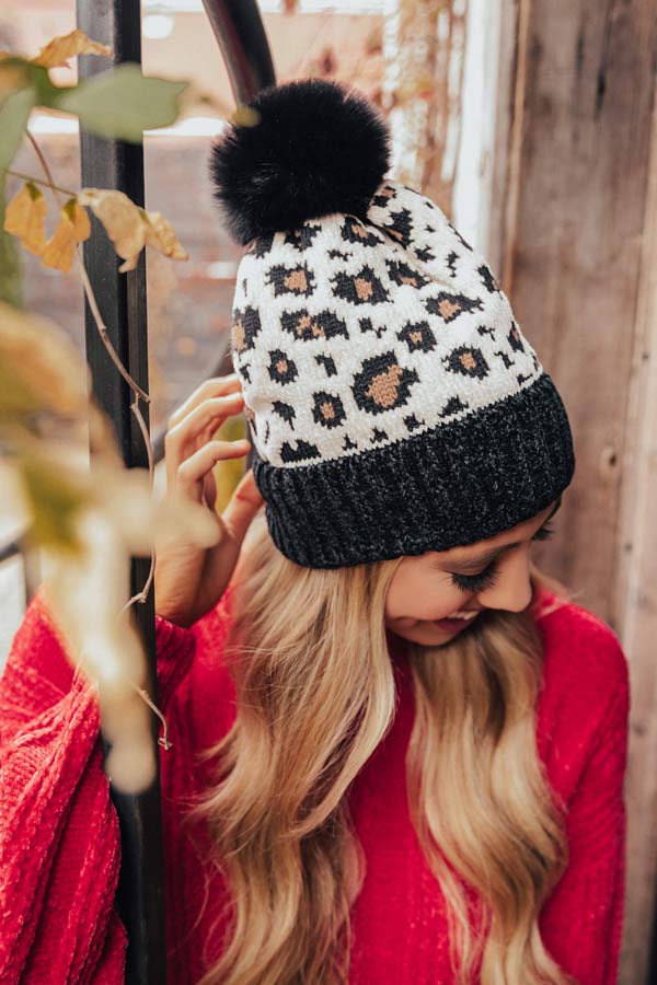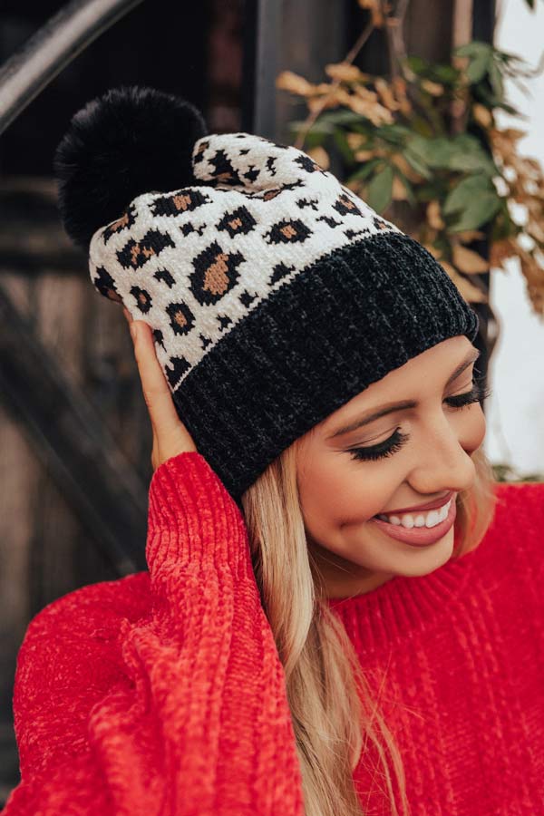 You are sure to be a "bonfire bombshell" when you wear this black beanie featuring soft loose knit material with wide ribbed texturing on the trim, a bold brown and black leopard print, and a pom pom accent!