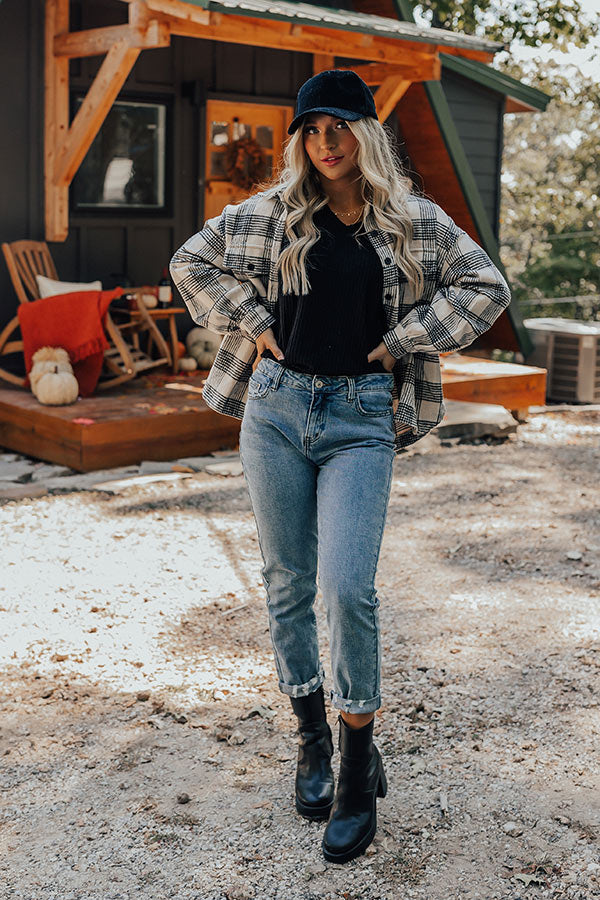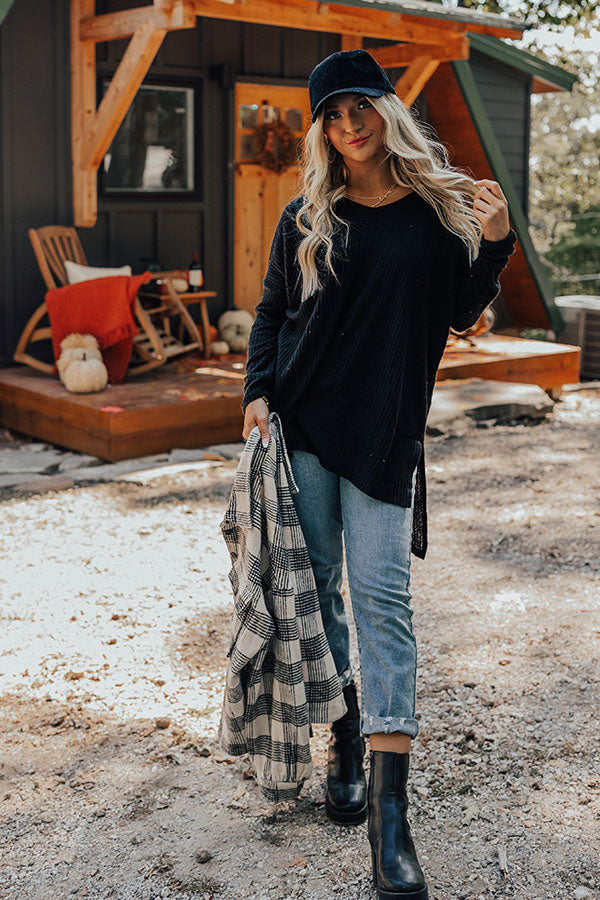 Our 'Bonfire Date' waffle knit tunic will give you that fall feeling! Features black colored waffle knit fabric, v-neckline, long fitted sleeves, and a relaxed silhouette that falls into an uneven hemline with accent side slits.