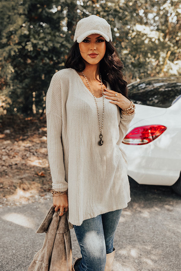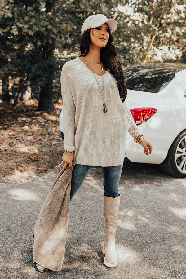 Our 'Bonfire Date' waffle knit tunic will give you that fall feeling! Features cream colored waffle knit fabric, v-neckline, long fitted sleeves, and a relaxed silhouette that falls into an uneven hemline with accent side slits.