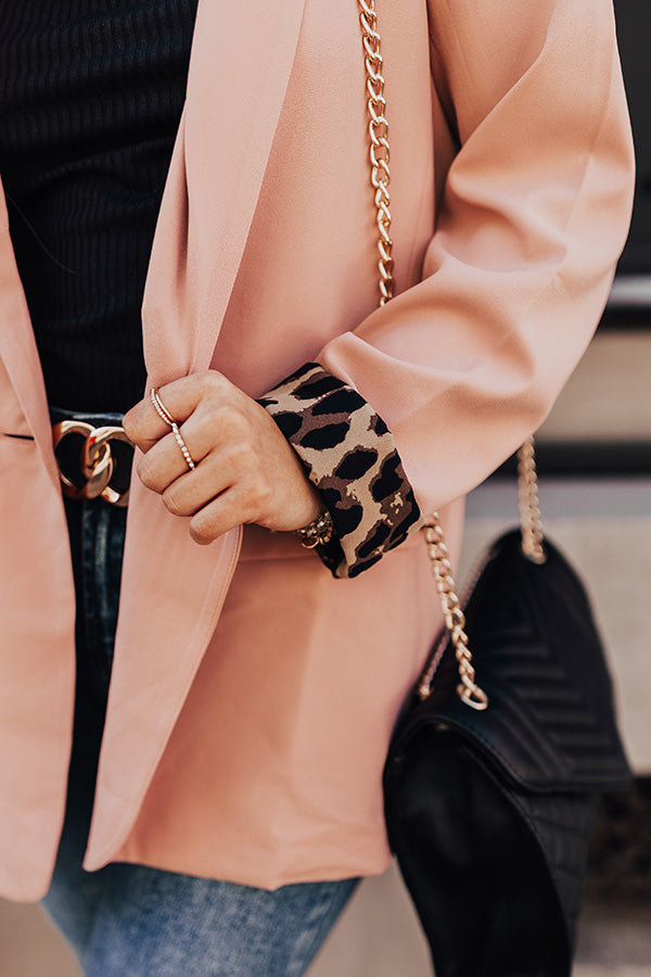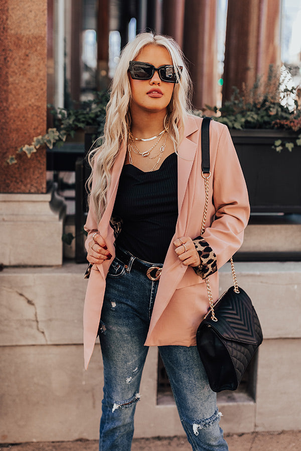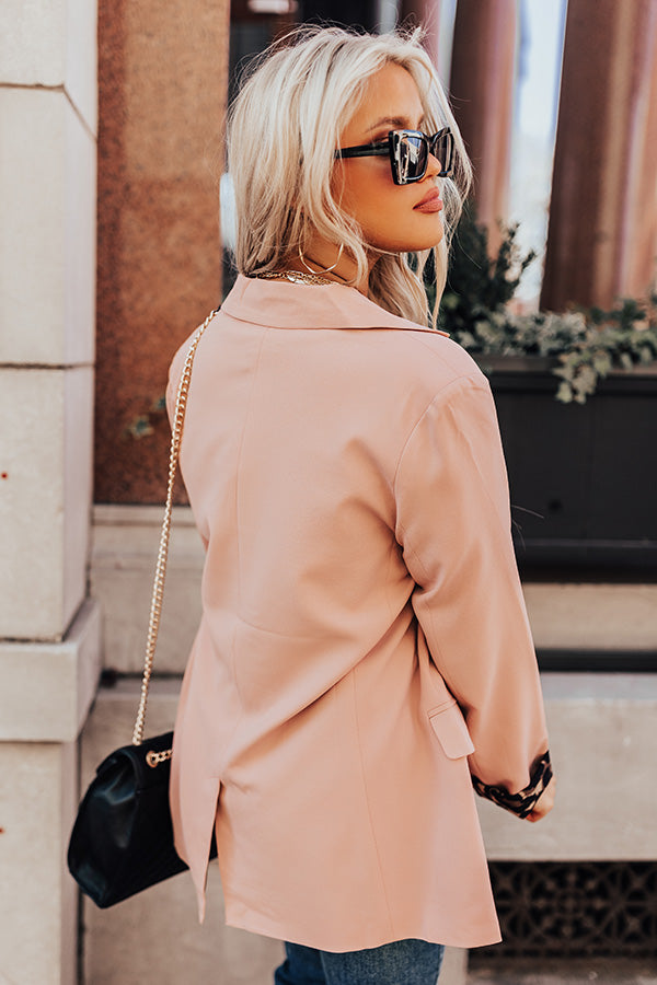 Add a fun pop of print and color to your office look with our light natural/pink hued 'Bonjour Bliss Blazer' featuring sleek lightweight material with lined with a bold black and brown leopard print, long loose sleeves, two low pocket cuts, a single button front closure, a collared neckline, and a relaxed but sophisticated silhouette that ends in a straight hemline! Measurements