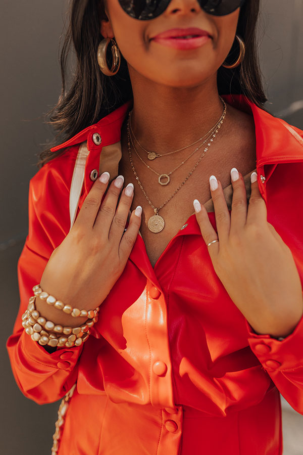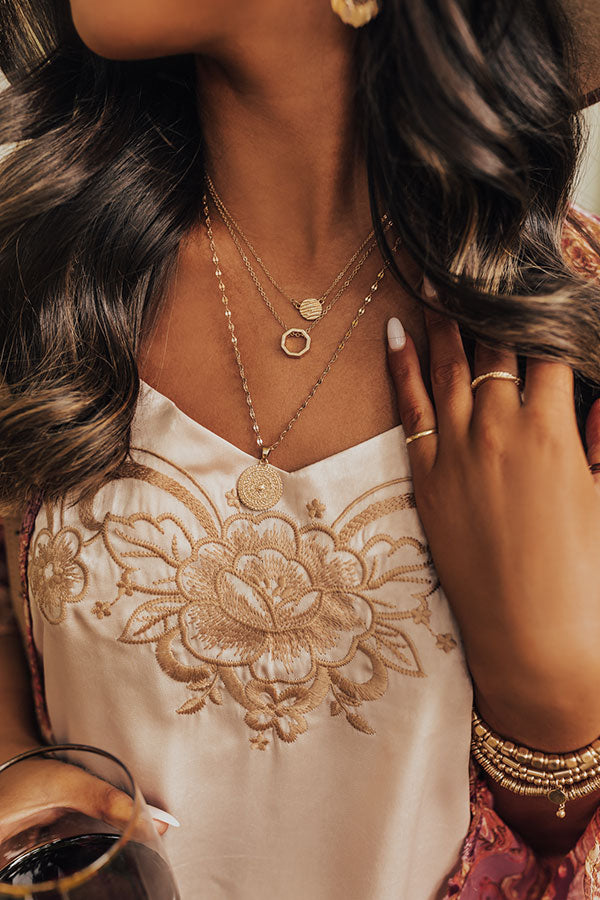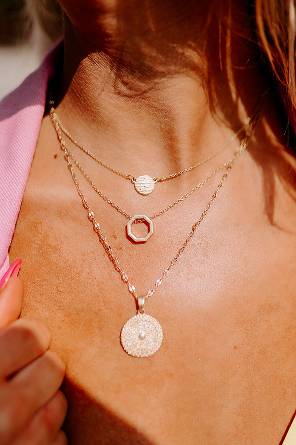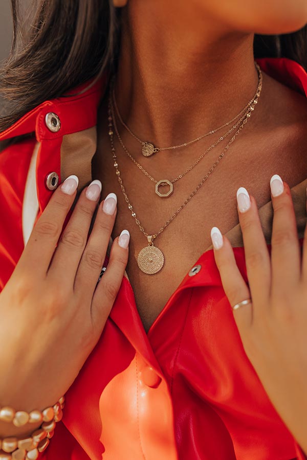 Accessorize effortlessly with our pretty 'Book It Layered Necklace' featuring three layered pieces: a short dainty chain with a gold circle charm, a medium length chain with a gold hoop charm, and a longer chain with a flap gold pendant!