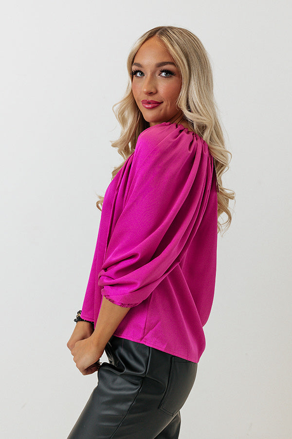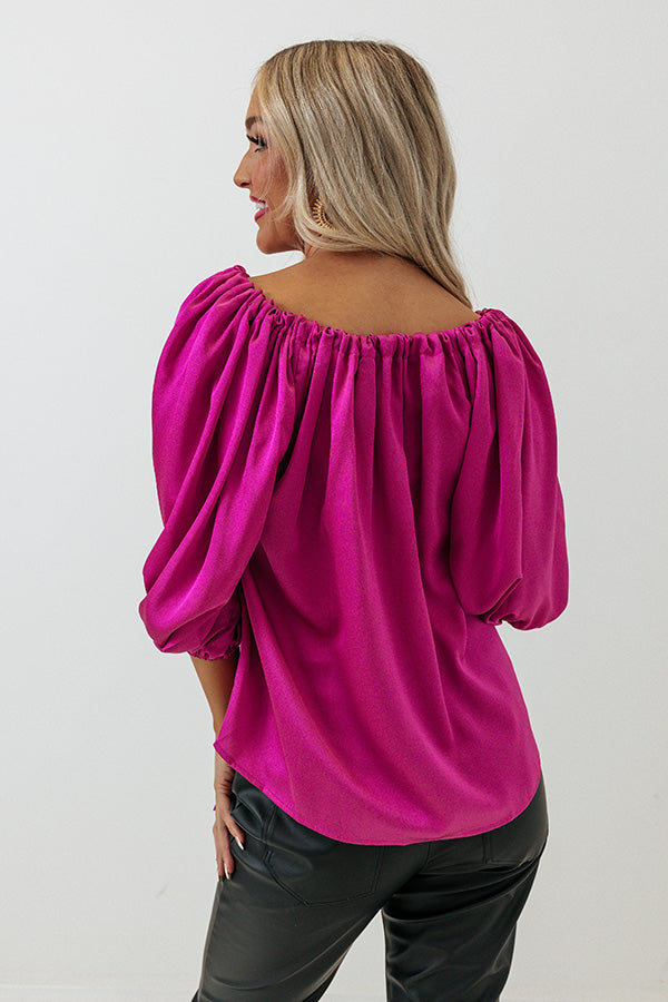 You will look like the ultimate boss babe in this chic berry colored shift top featuring sleek lightweight material, a wide tie closure v-cut neckline that can be worn on- or off-shoulder, loose 3/4-length sleeves, and a slouched silhouette that falls into a straight hemline!