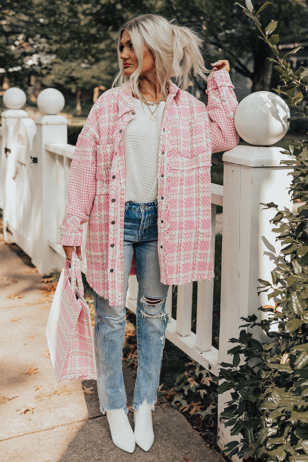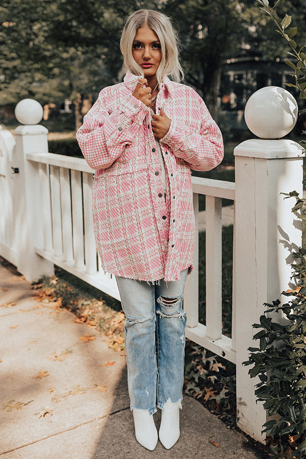 Layer up in the trendiest of ways with our adorable pink 'Boston BFF' jacket featuring tweed material, a button down front with a collared neckline, long loose sleeves with button closure cuffs, a single accent chest pocket and two low pockets, and a relaxed silhouette that ends in a rounded raw-cut hemline!