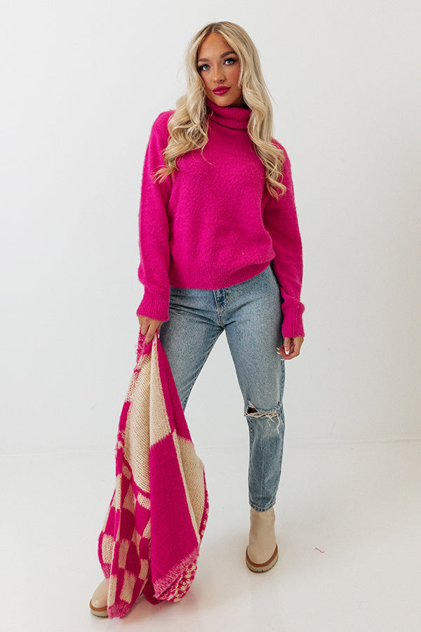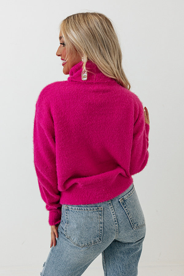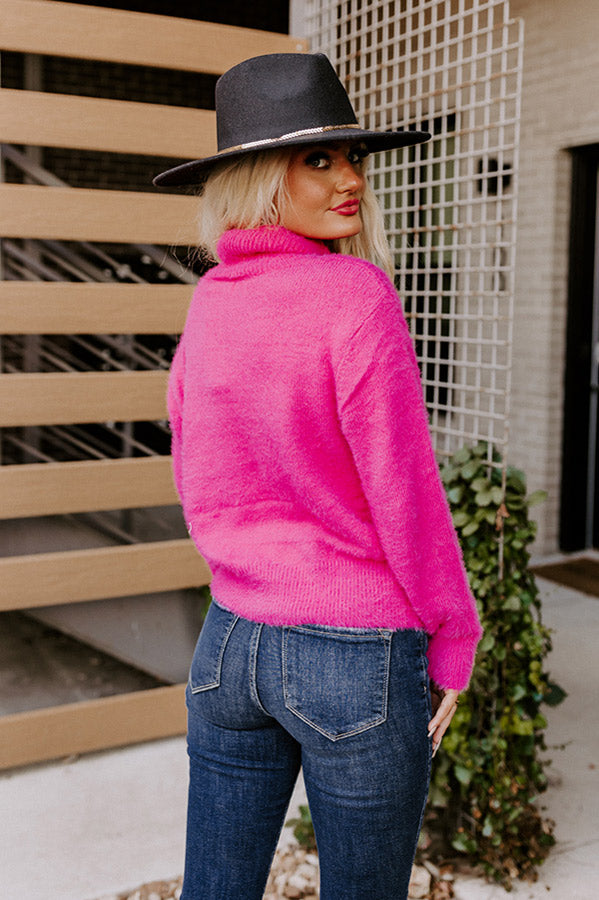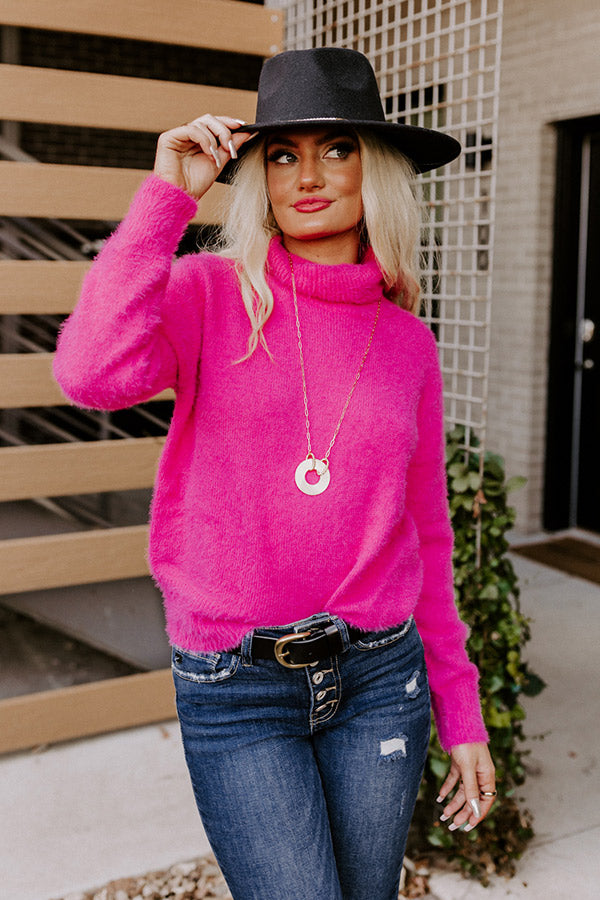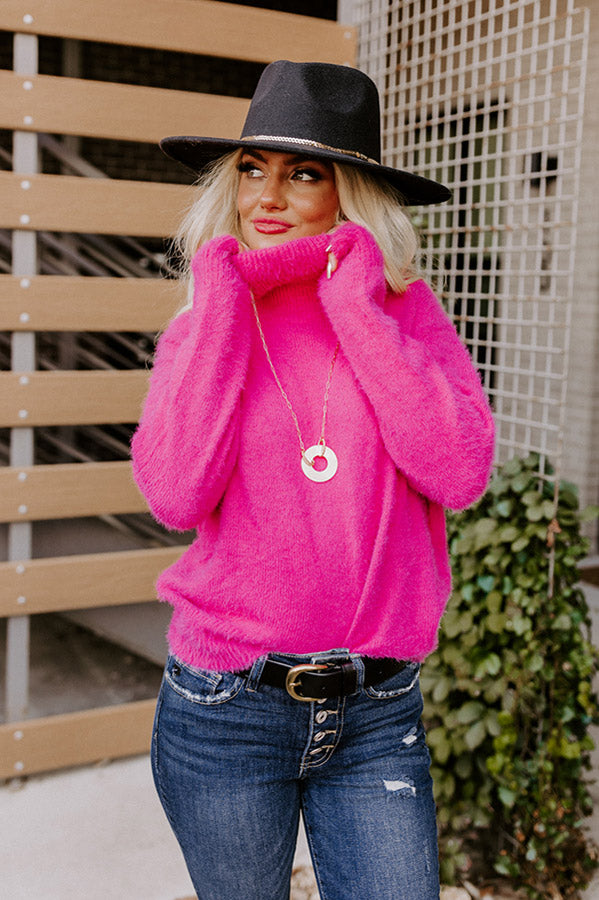 Our 'Boston Chill' eyelash knit sweater will give you that warm and fuzzy feeling this season! Features fuzzy hot pink colored material rolled turtleneck neckline, long fitted sleeves with ribbed cuffs, a relaxed silhouette that falls into a straight hemline with ribbed detail.