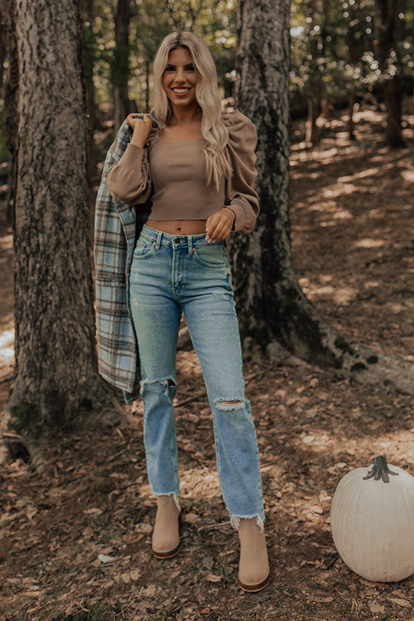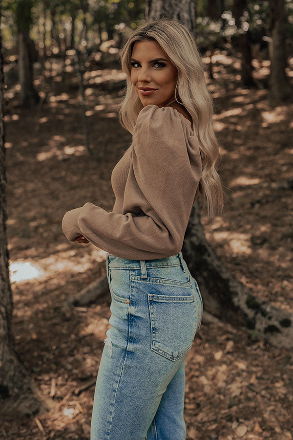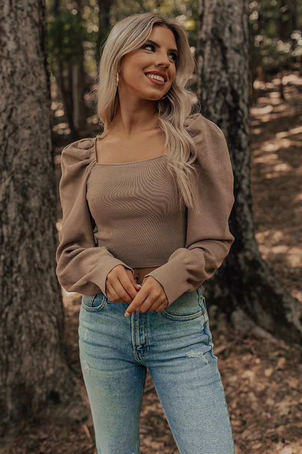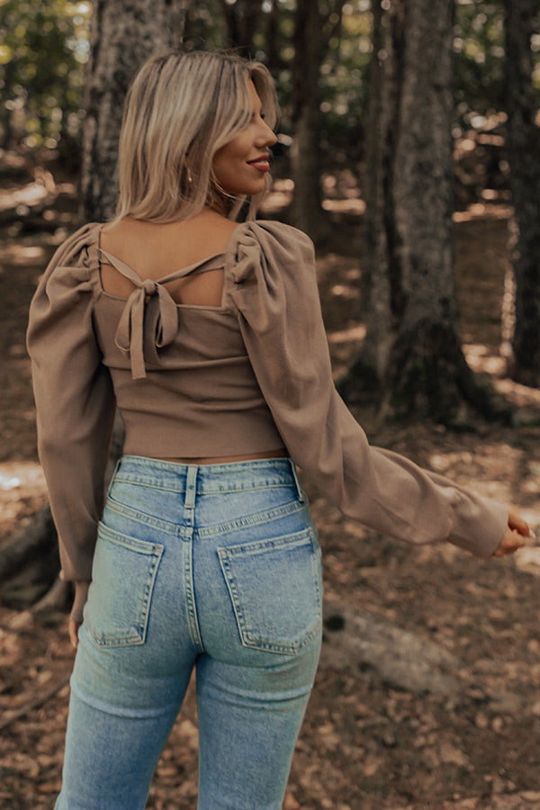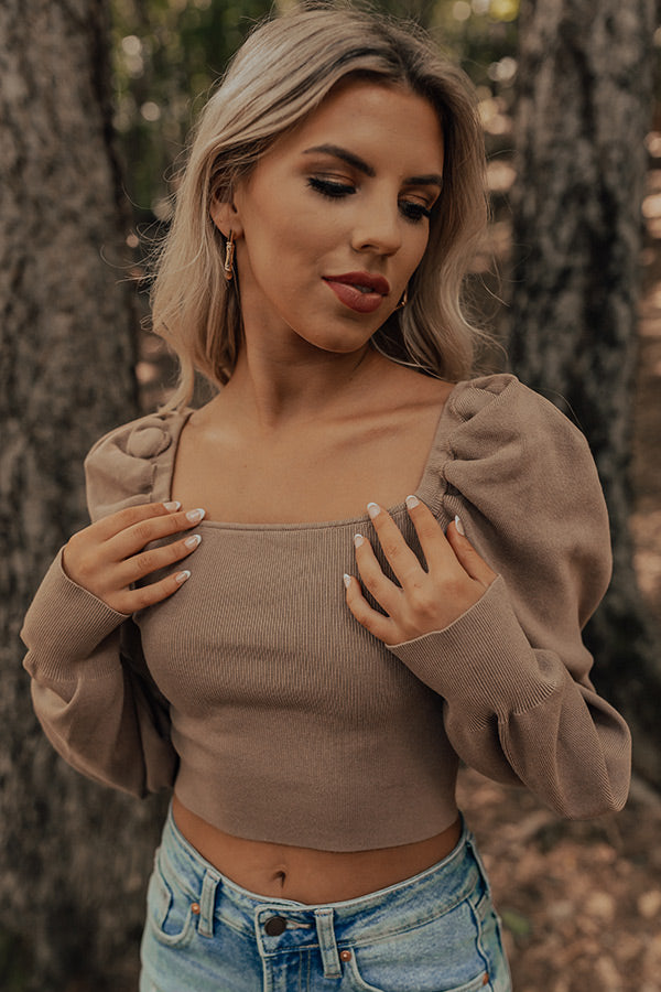 It's almost sweater weather time and we have the perfect one for you! Our pretty warm taupe colored 'Boston Nights' top features lightweight knit material, a flirty square neckline and upper back with a tie closure across the shoulders, long sleeves with puff shoulder accents, and a flattering silhouette that ends in a straight cropped hemline!