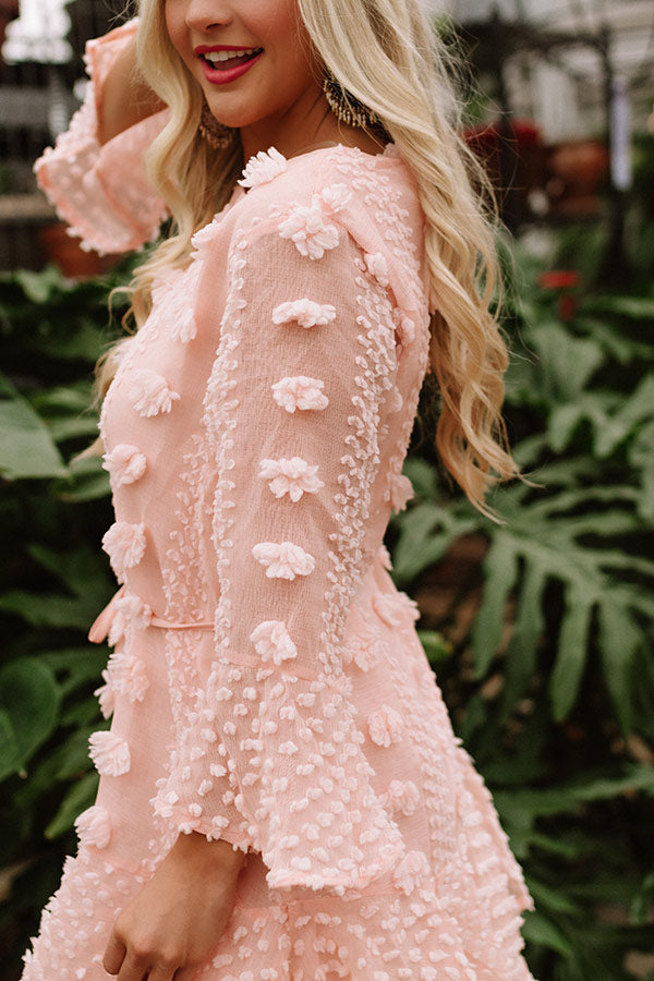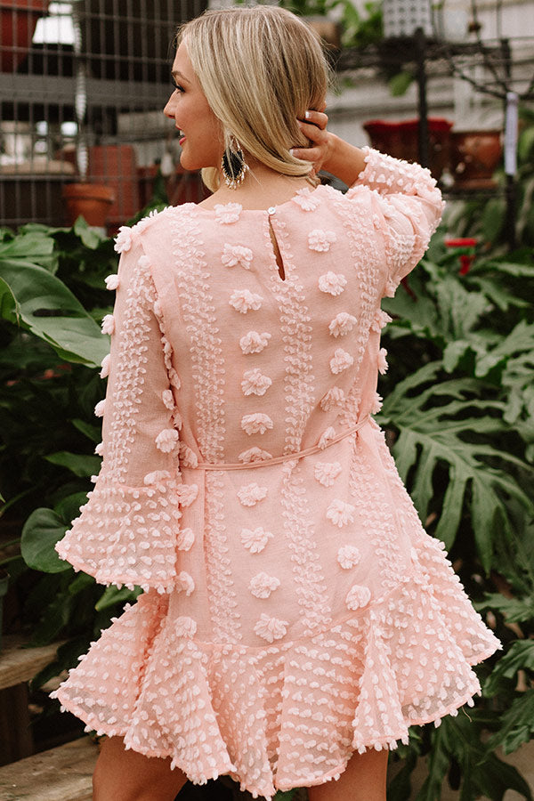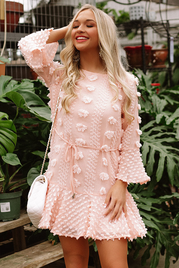 You will look like you're "bound for Broadway" when you wear this stunning peach colored shift dress featuring lightweight material patterned with small and large polka dot texturing, a high rounded neckline, a keyhole accented upper back with a button closure, long semi-sheer loose half sleeves with ultra flared cuffs, a tie string belt, and a relaxed silhouette that falls into a peplum bottom with an uneven mid-thigh length hemline! PLUS, it includes a sewn in slip! You can style this piece with some neutral wedges and a white crossbody, or with "The Jess Faux Suede Heel in Natural" and our "Plans In Paris Wool Hat in Taupe!" Measurements