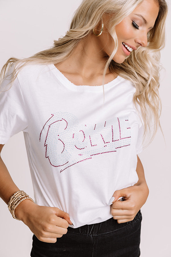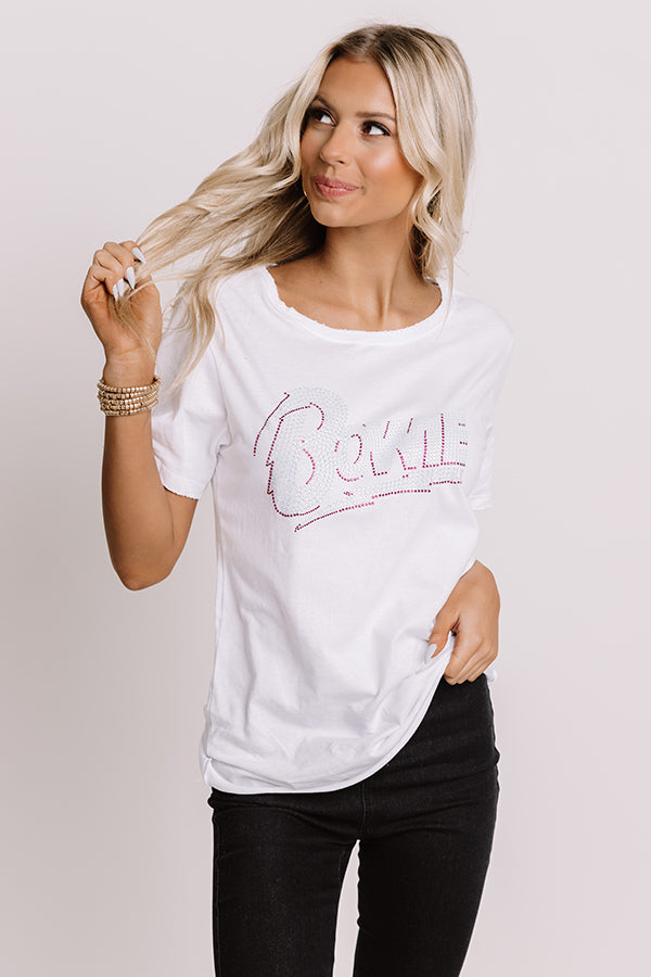 Looking for an exclusive tee to rep one of the most iconic rock figures of all time? Then this cutie is for you! Our white "Bowie" tee features soft cotton material embellished with pink and blue crystals, a high rounded neckline, short loose sleeves, and a relaxed silhouette that falls into a straight hemline!