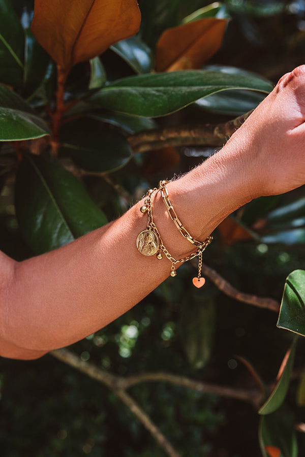 This stunning bracelet features 14k gold plated mixed double strand chain bracelets with reversible saints coins!
