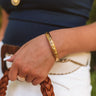 You are sure to love this gold stardust bracelet that matches our stardust hoops perfectly! It features a textured 18K gold plated over stainless steel bangle that is tarnish resistant!