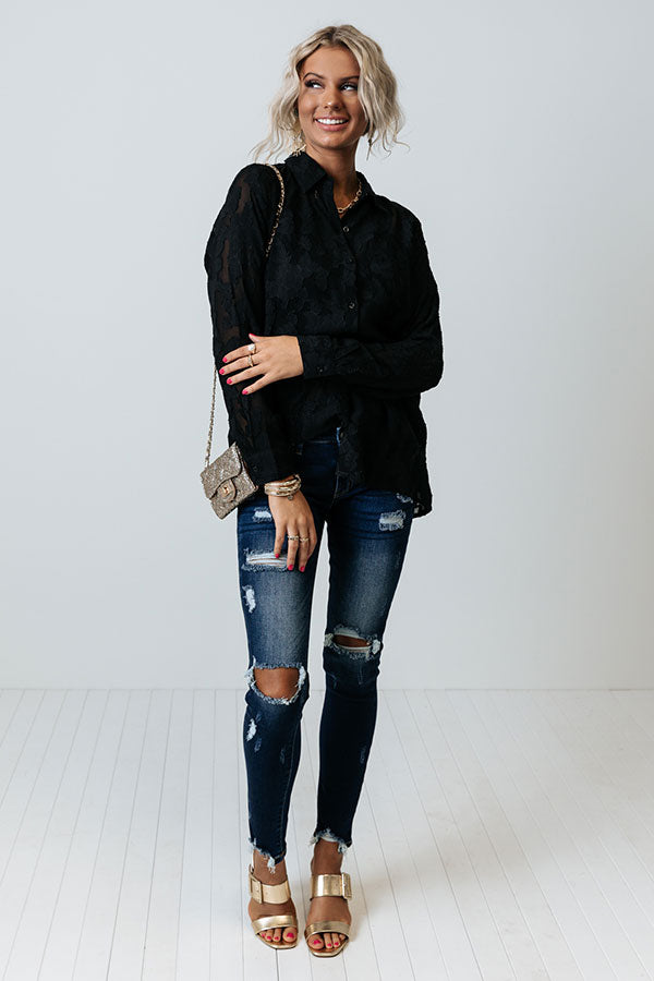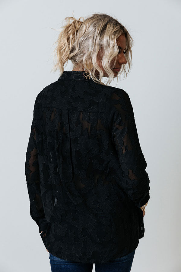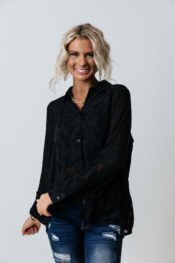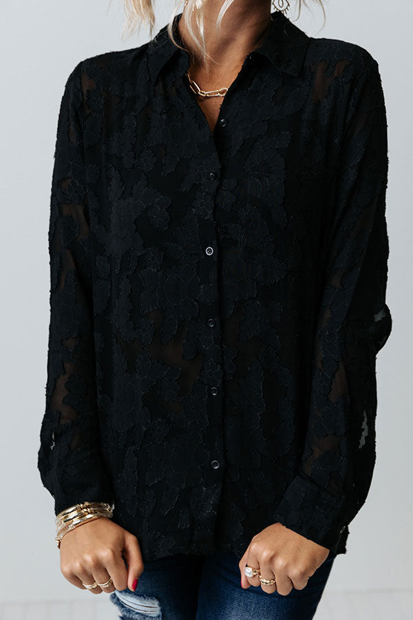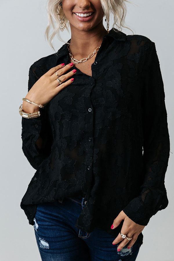 People are sure to brag about how amazing your style is when you complete your look with this casual but cute black top featuring lightweight material with unique texturing, a button up front with a collared neckline, long loose sleeves with button closure cuffs, and a relaxed silhouette that falls into a rounded hemline! Measurements