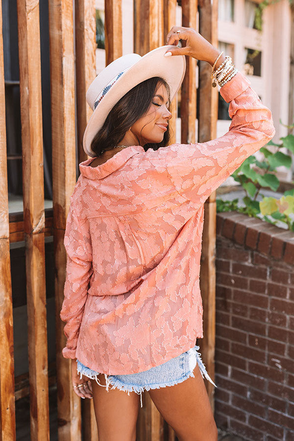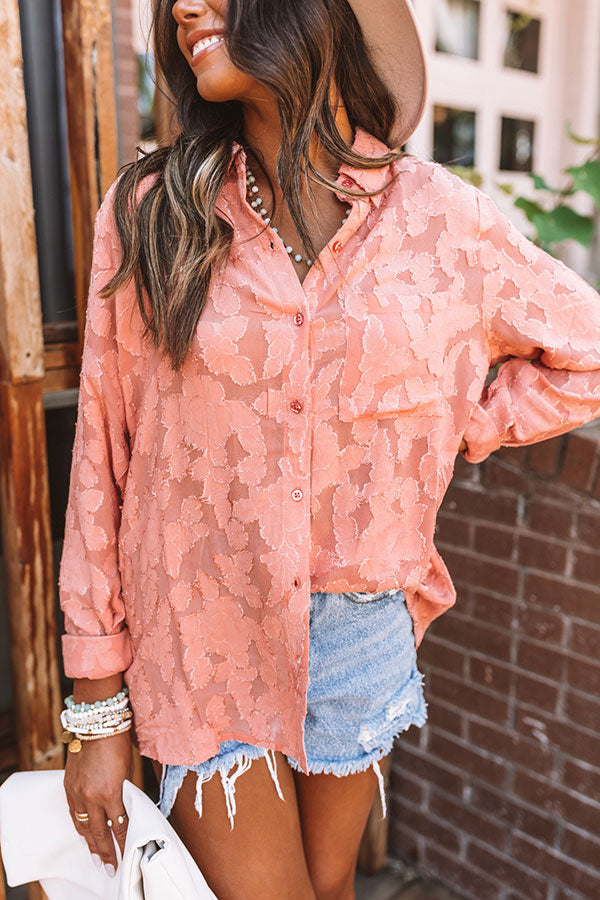 People are sure to brag about how amazing your style is when you complete your look with this casual but cute coral colored top featuring lightweight material with unique texturing, a button up front with a collared neckline, long loose sleeves with button closure cuffs, and a relaxed silhouette that falls into a rounded hemline!