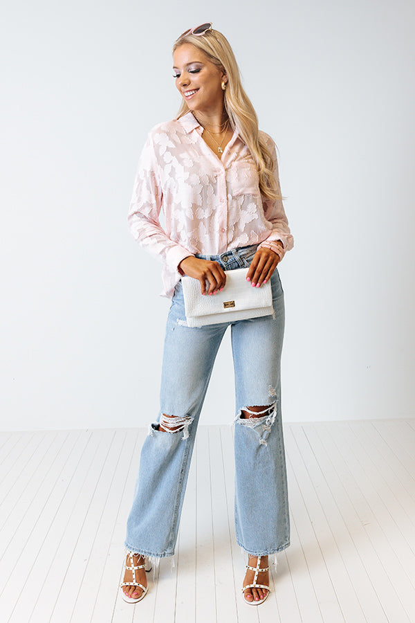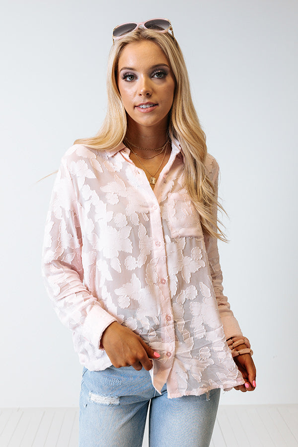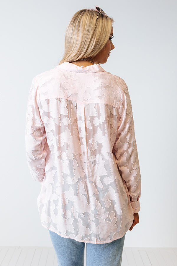 People are sure to brag about how amazing your style is when you complete your look with this casual but cute light pink top featuring lightweight material with unique texturing, a button up front with a collared neckline, long loose sleeves with button closure cuffs, and a relaxed silhouette that falls into a rounded hemline!