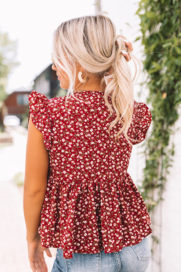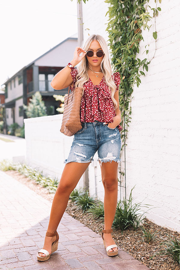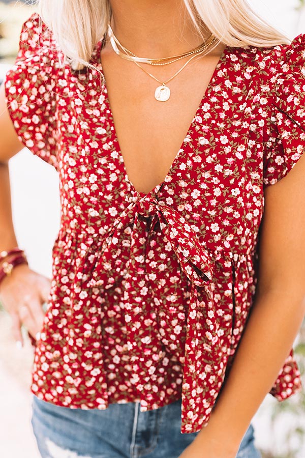 Arrive in a brand new look with this darling wine colored top featuring lightweight flowy material patterned with a small floral print, a v-cut neckline with a tie closure, ruffled cap sleeves, and a flirty babydoll silhouette that falls into a straight hemline!