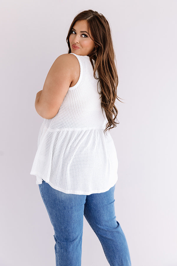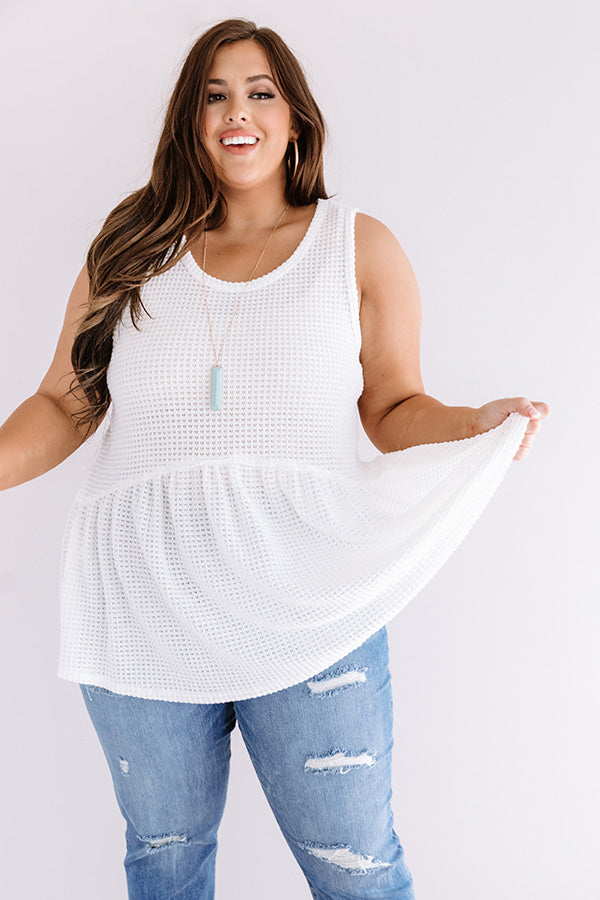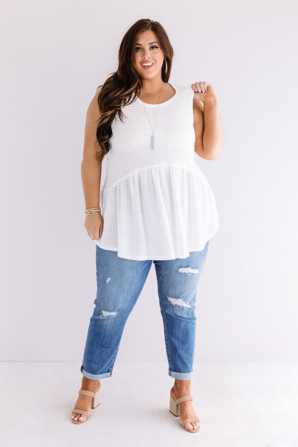Plus Size - "Break away" from the norm with this adorable white tank top featuring soft lightweight material with waffle knit texturing, a high rounded neckline, wide 2-inch shoulder straps, and an ultra relaxed babydoll silhouette that falls into an uneven tunic length hemline! You can style this casual cutie with some distressed ankle skinnies and neutral heels, but you can also wear it layered under a cropped jean jacket with some distressed black shorts, "The Allen Wedge in Snake Print," a matching snake print hair scarf, and our "Neutral Territory Snake Print Tote in Black!" Measurements