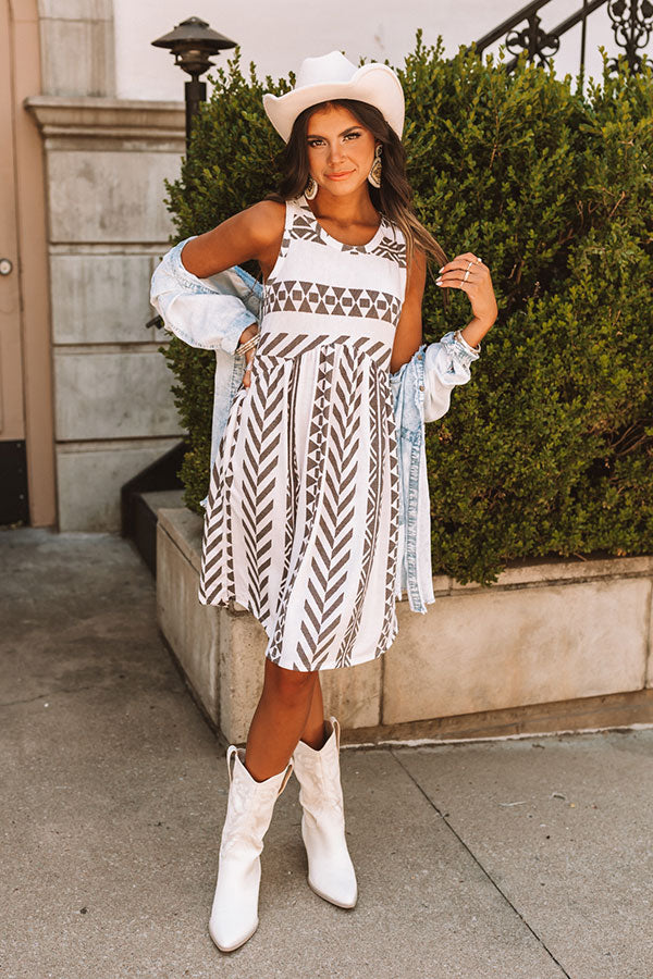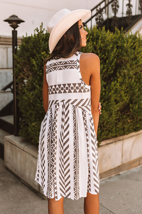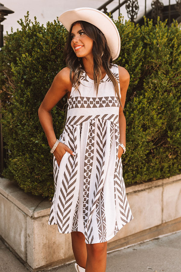 The perfect boho summer piece, our cute white 'Breakaway Beach Dress' features lightweight material patterned with brown aztec print accent stripes, a rounded neckline, sleeveless shoulder straps, hidden side pockets, and a relaxed silhouette that ends in a straight mid-thigh length hemline!