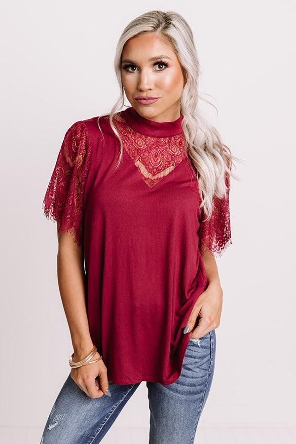 Add a dainty side to your wardrobe with our elegant wine colored "Breaking News" top featuring lightweight material, semi-sheer lace detailing around the v-cut neckline with solid colored 2-inch shoulder straps, short lace sleeves with zigzag trim detailing, a high collared neckline with a keyhole accented back button closure, and a flattering silhouette that ends in a straight hemline! Measurements