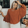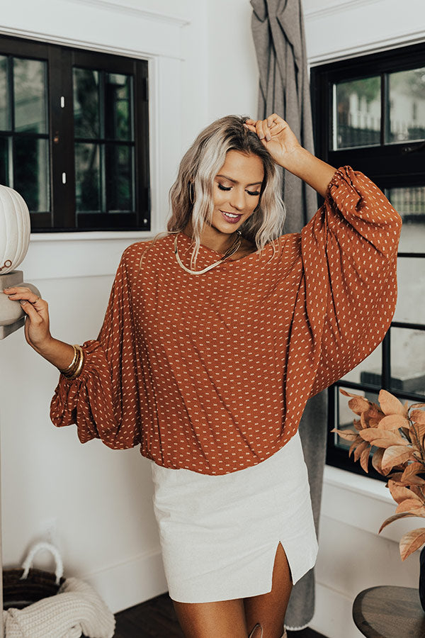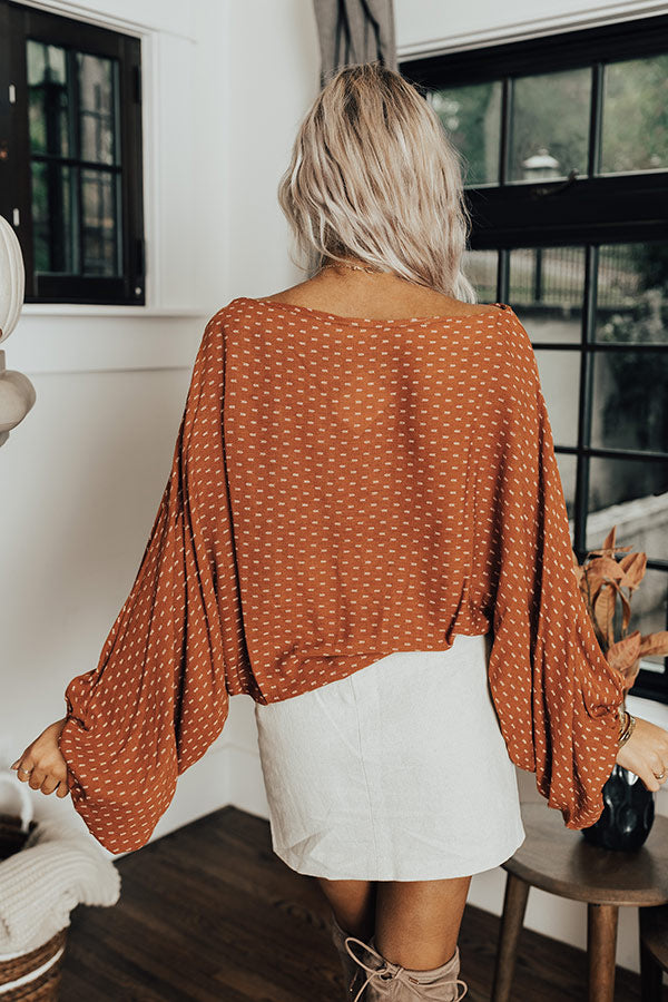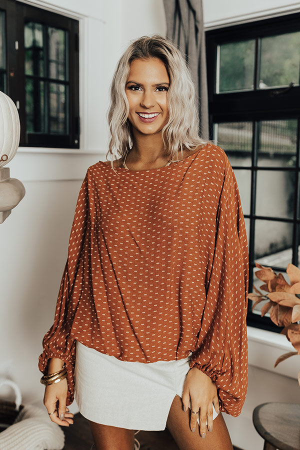 Slay all day in our pretty rust hued 'Breathe Deep Top' featuring lightweight material patterned with a natural hued spotted print, a rounded neckline, long oversized batwing sleeves, and a slouched silhouette that falls into a straight hemline!