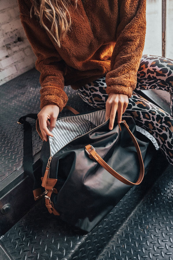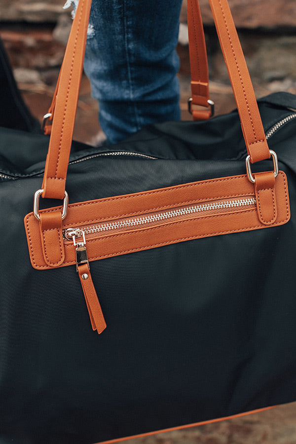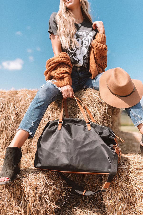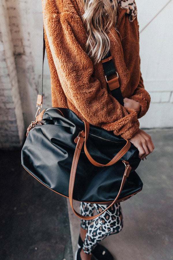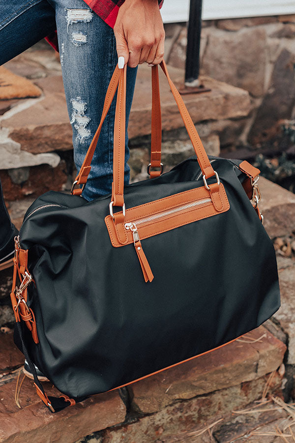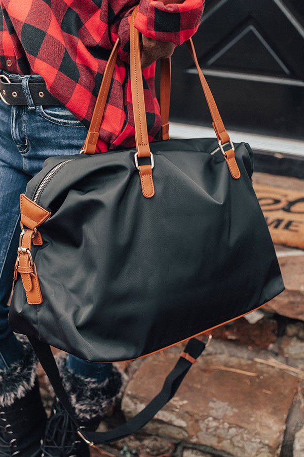 There is no better bag to take on your "Breckenridge vacay weekend" than this black tote featuring two handles, a sleek outer finish, a spacious inner pouch with additional pockets, and a removable and adjustable shoulder strap!