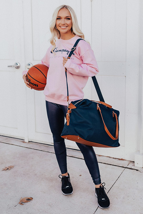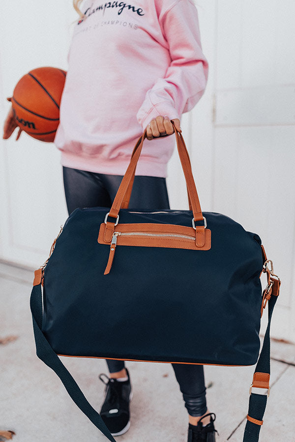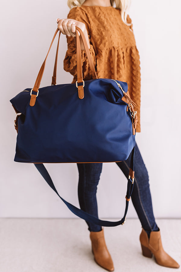 There is no better bag to take on your "Breckenridge vacay weekend" than this navy tote featuring two handles, a sleek outer finish, a spacious inner pouch with additional pockets, and a removable and adjustable shoulder strap!