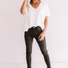 Relax and take it easy in this white shift top featuring a lightweight textured fabric, v-cut neckline that can be worn off one shoulder, short loose sleeves, and an ultra slouched bodice that falls into a rounded hem that looks great tucked in or even knotted! Styling this comfortably chic shift top is a breeze... just throw it on under your fave plaid some frayed black skinnies, leopard booties, and a chic clutch, or pair it with some distressed denim shorts, "The Karlie Perforated Bootie in Grey," and our "All Caught Up Headband in Grey" for a look that is weekend ready!