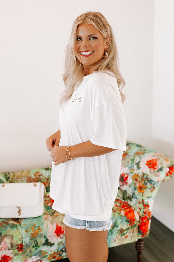 Keep casual during the excitement of your big day with our adorable white plus size 'Bride Shift Tee' featuring lightweight cotton-blend material with cute gold cursive lettering on the front, a rounded neckline, short loose sleeves, and a relaxed silhouette that ends in a straight hemline! Measurements