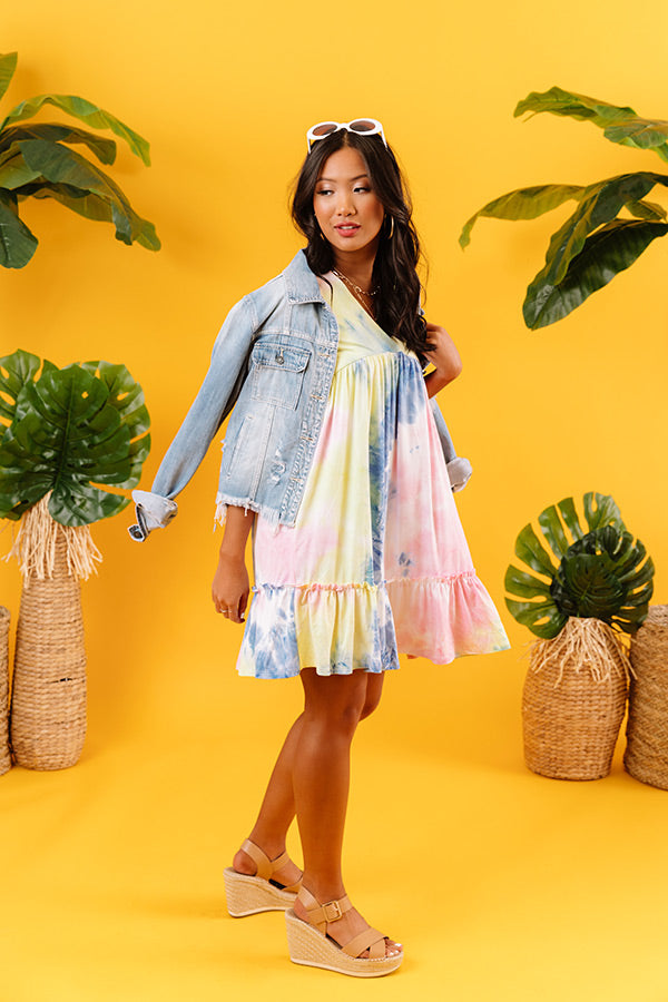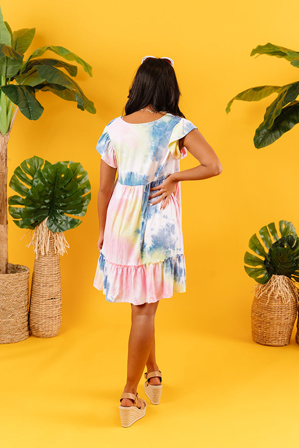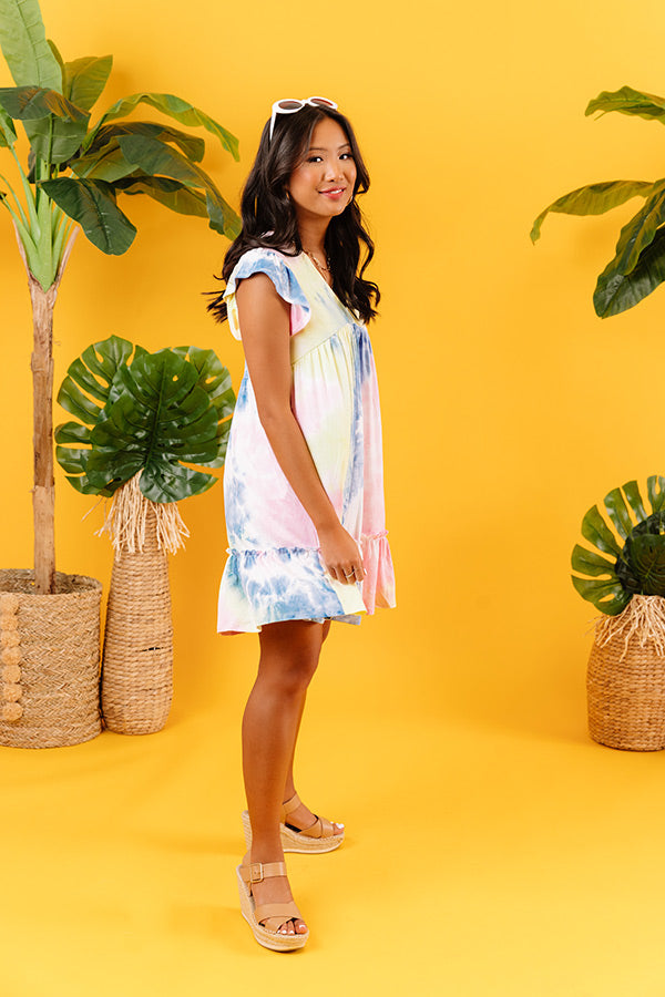Your OOTD is sure to look bright and bubbly when you wear this adorable dress featuring lightweight breezy material patterned with blue, pink, and yellow tie dye, a v-cut neckline, ruffled cap sleeves, and a relaxed silhouette that falls into a straight mid-thigh length hemline! Measurements