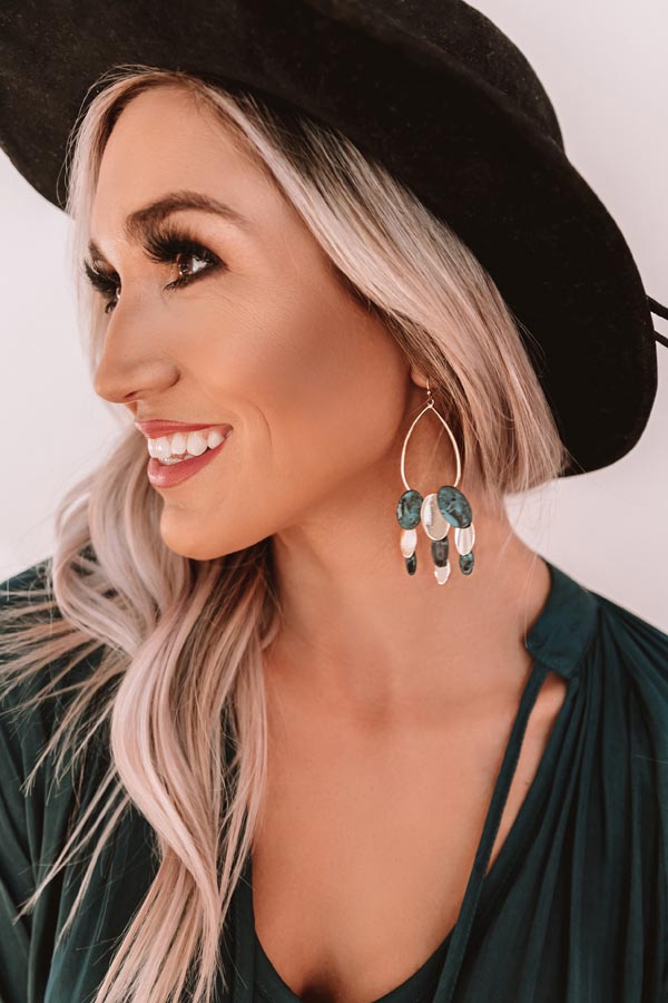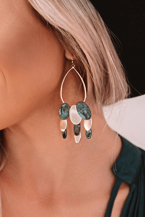 All eyes will surely be on you when you accessorize with our "Bright Skies" statement earrings featuring dainty teardrop hoops and dangling gold and green hued charms!
