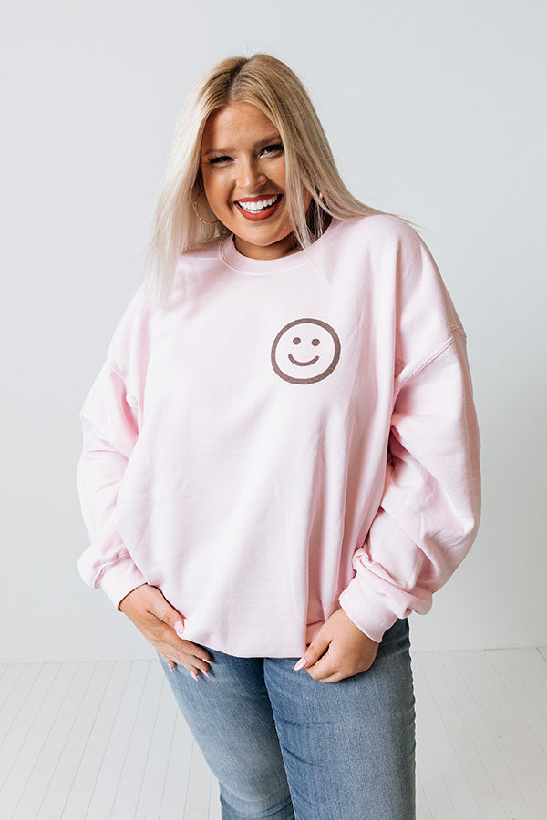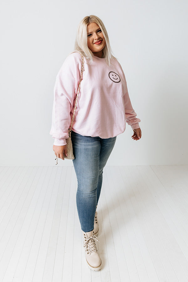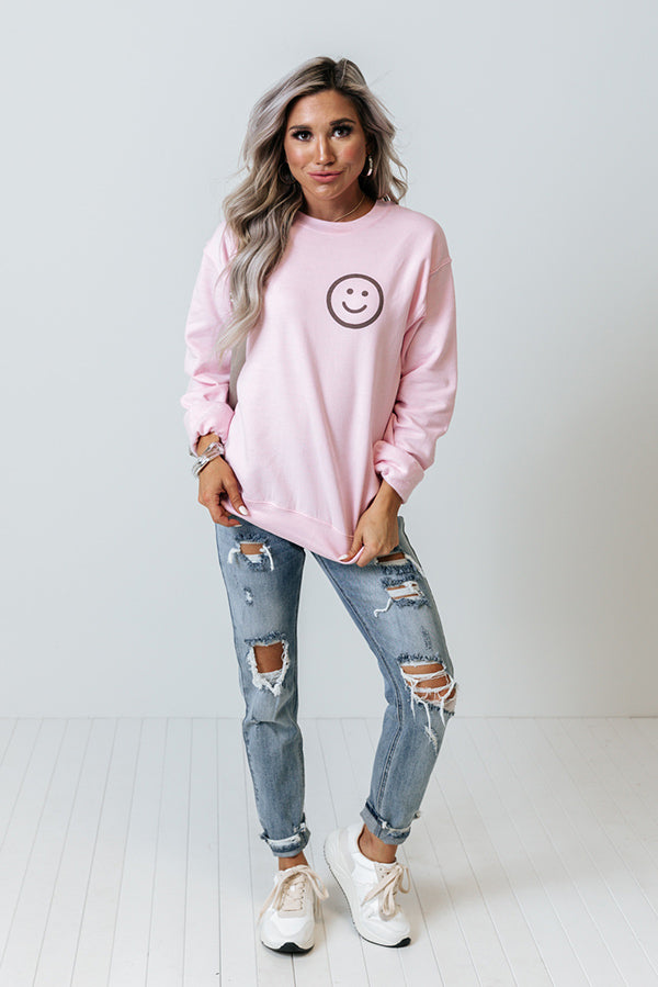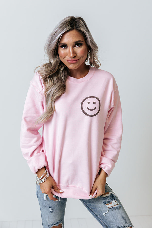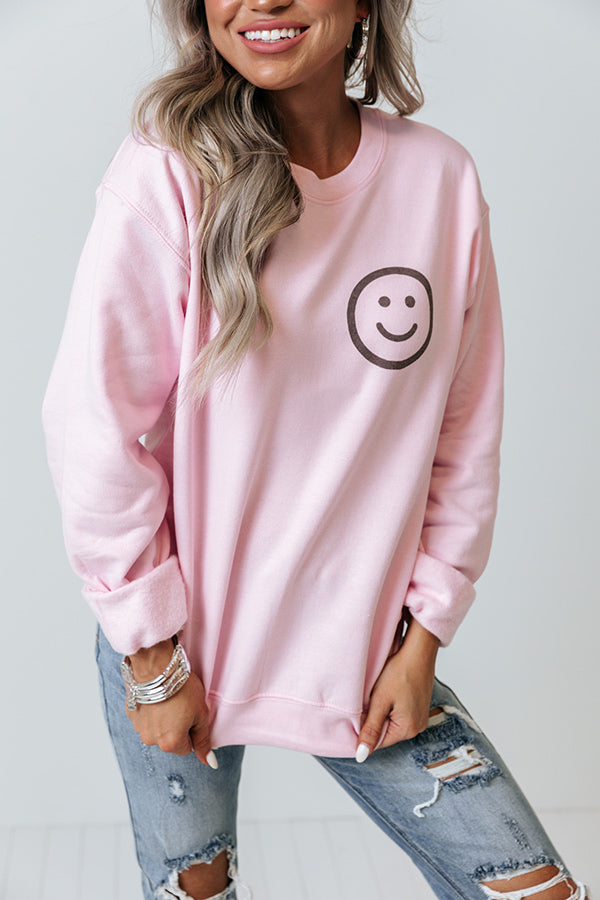Let your smile shine bright in this cute pink sweatshirt featuring soft lightweight material with a small smiley face graphic on the front, a rounded neckline, long loose sleeves with fitted cuffs, and a slouched silhouette that ends in a straight hemline! Measurements