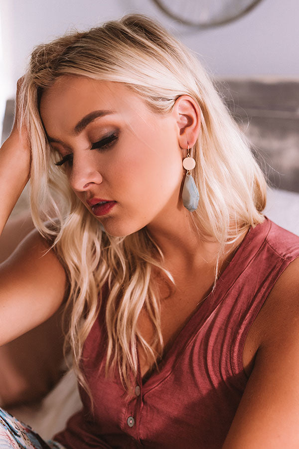 Add a luxe flair to your OOTD by accessorizing with our stunning "Brighton Bay" statement earrings featuring dangling gold circle pendants with large airy blue stones!