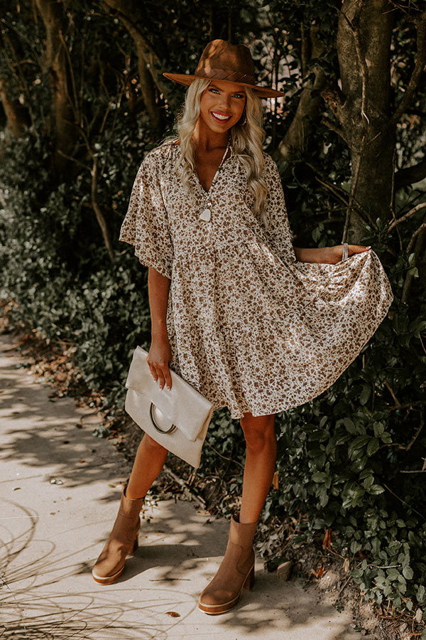 Transitioning to fall has never been easier with our charming 'Brighton Bistro' dress featuring lightweight material patterned with a pretty brown floral print, a v-cut neckline, loose half sleeves, and a relaxed babydoll silhouette that falls into a straight mid-thigh length hemline!