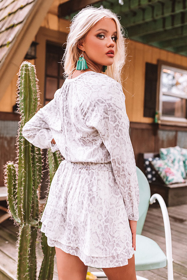 Strike a pose in our gorgeous "Brighton Rooftop" dress featuring lightweight material patterned with a grey snake print, a button up bodice with a v-cut neckline, long loose sleeves with button closure cuffs, a wide fitted smocked waistline, and a relaxed skirt silhouette that falls into an uneven mid-thigh length hemline! We have styled this stunning piece with some turquoise statement accessories and matching white wedged booties, but you can also wear it with "The Jess Faux Leather Heel in Grey," our "Plans In Paris Wool Hat in Cream," and our "New On The Block Faux Leather Fringe Tote in Grey!"