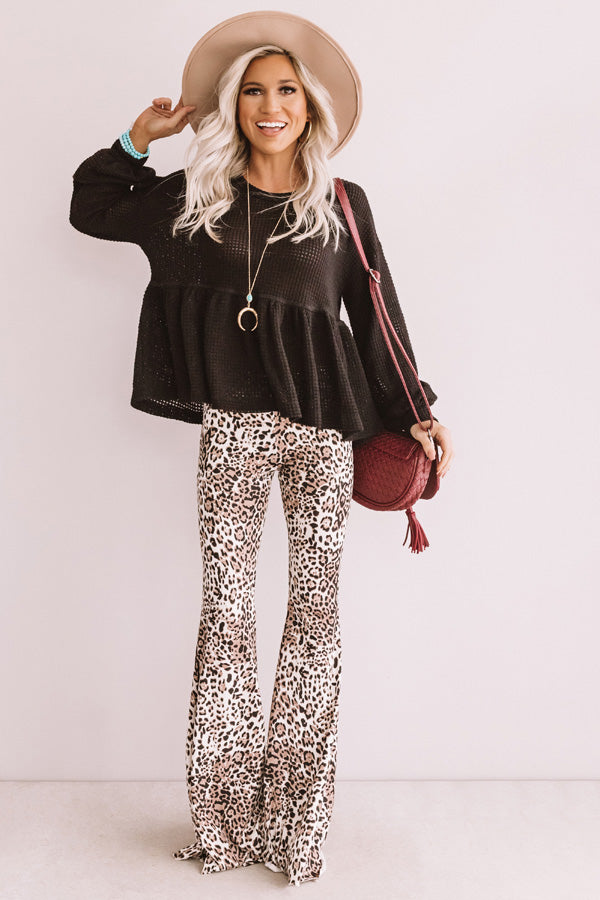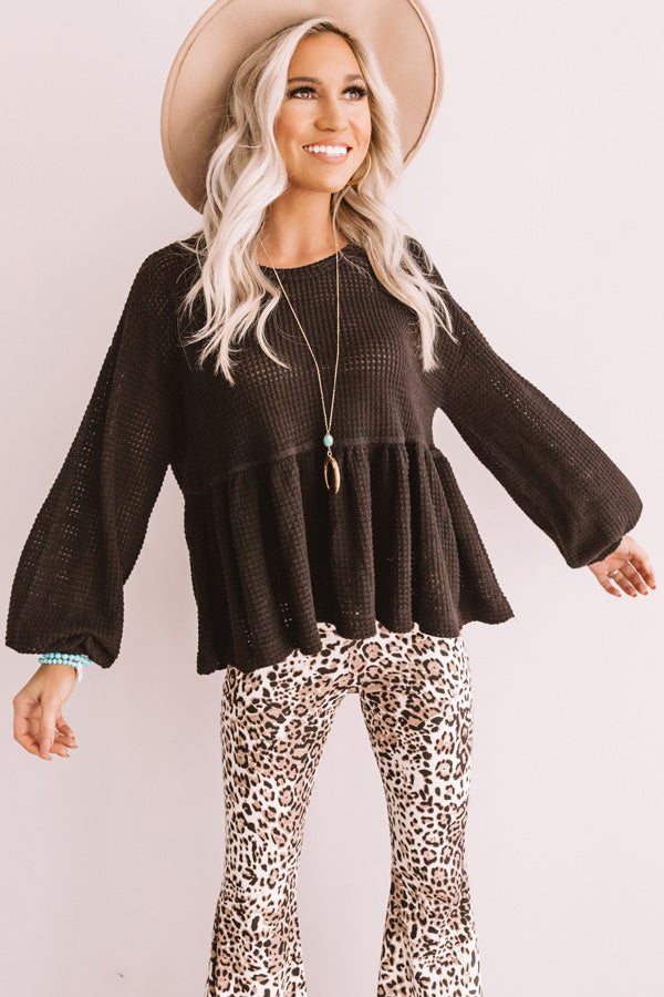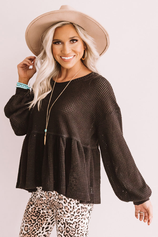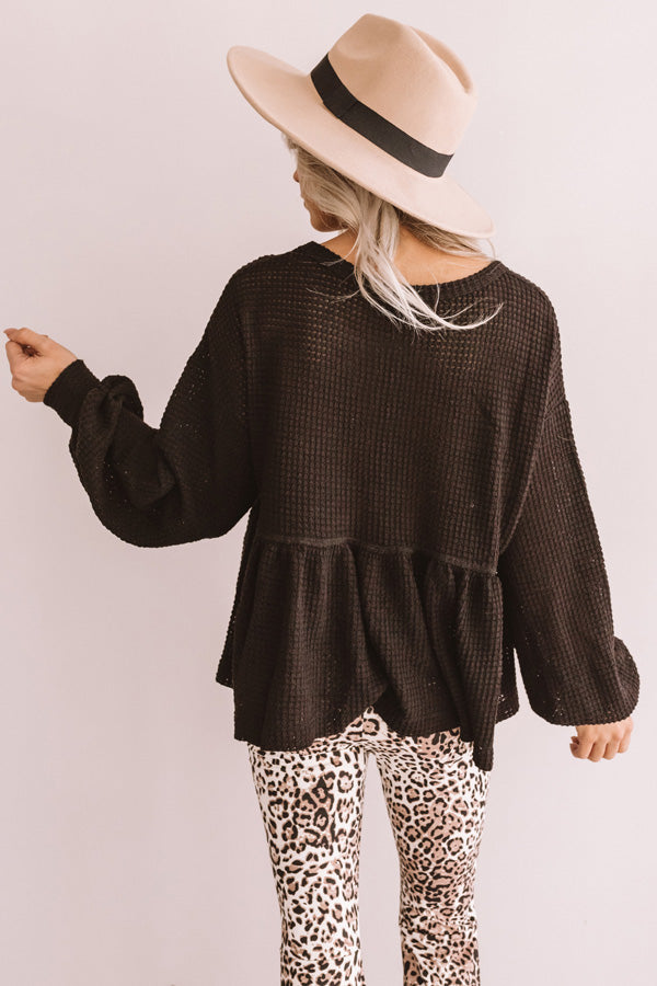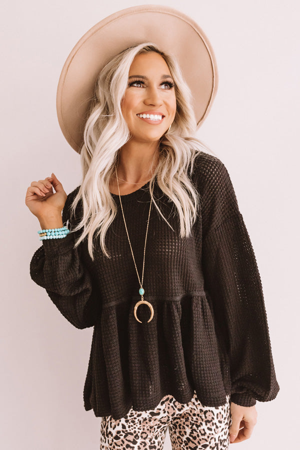 You will be telling the chilly fall weather to "bring it on" when you have this black shift top in your cold weather wardrobe! It features lightweight material with waffle knit texturing, a high rounded neckline, long loose bishop sleeves with fitted elastic banded cuffs, and a relaxed bodice that falls into a peplum bottom with an uneven hemline! We have styled this casual transitional piece with some leopard flares, a maroon crossbody, and a neutral faux suede hat, but you can also layer it under an ivory knit cardigan with our "Sweet Victory High Waist Corduroy Skirt in Wine" and "The Emmaline Bootie in Black!" Measurements