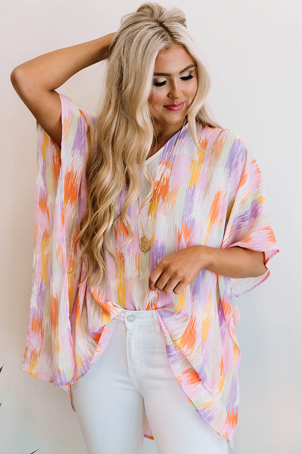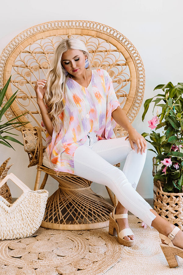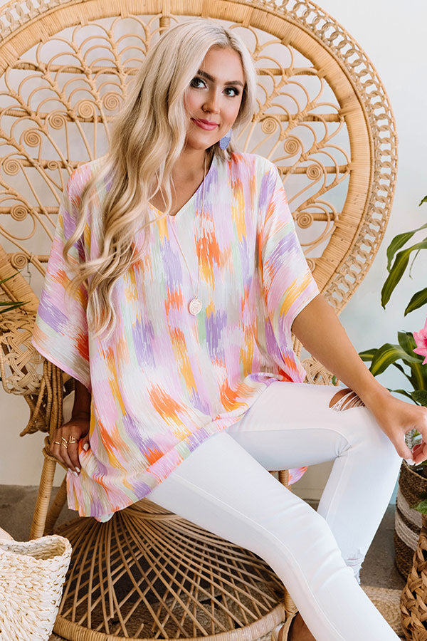 Create your own sunshine in this stunning shift tunic featuring lightweight breezy material patterned with an abstract colorful print, a v-cut neckline, oversized bat-wing half sleeves, and an ultra relaxed silhouette that falls into an uneven upper-thigh length hemline! We have styled this cutie with some distressed white skinnies, matching statement earrings, and a woven block heel, but you can also wear it layered over your fave swimsuit with some frayed denim shorts and sunnies! Measurements