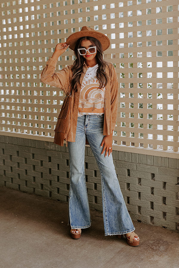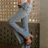 Stay groovy in our 'Bring The Flare Jean' featuring lightweight medium wash denim material with subtle accent fading, a high waistline with belt loops, a hidden zip fly with a button closure, a classic four-pocket cut, and a flattering silhouette that ends in flared hemlines with accent side slits! on products