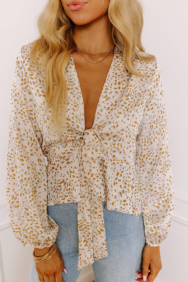 Show up and show out in our pretty cream hued 'Bring The Prosecco' top featuring sleek lightweight material patterned with a camel and airy blue hued spotted print, a deep v-cut neckline with a front tie detail, long loose sleeves, and a flattering silhouette that ends in an uneven hemline! on products
