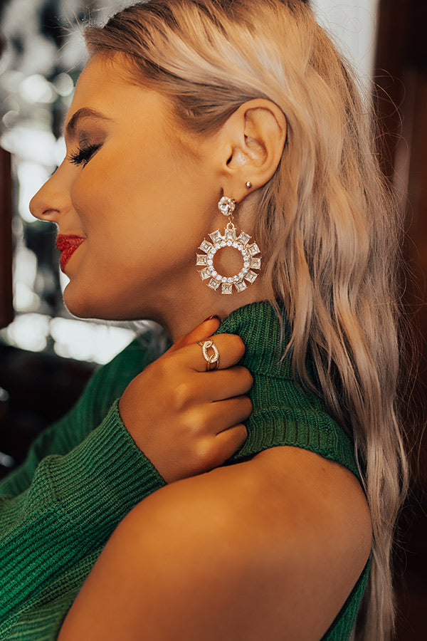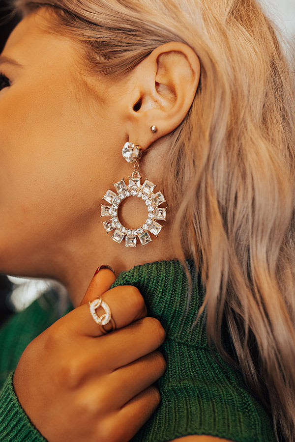 All eyes are sure to be on you when you accessorize with our beautiful 'Broadway And Bubbly' statement earrings featuring small clear circle rhinestone studs with dangling hoops composed of clear square rhinestones!
