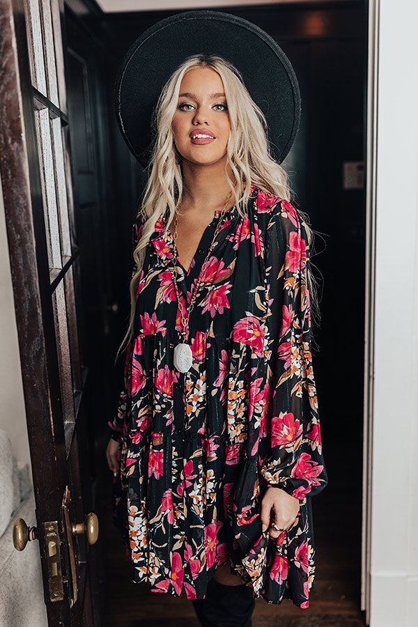 Be bold in our pretty black 'Broadway And Bubbly' shift dress featuring lightweight flowy material patterned with a vibrant fuchsia hued floral print, a button up front with a ruffled collar, long oversized sleeves, and a relaxed silhouette that falls into a a straight mid-thigh length hemline!