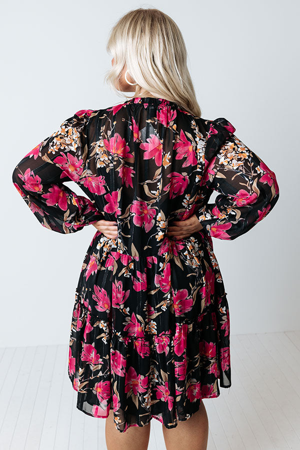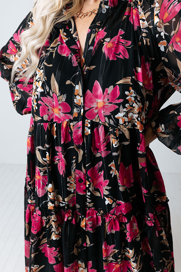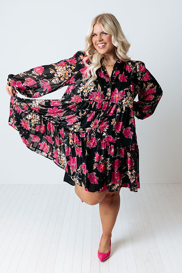 Be bold in our pretty black plus size 'Broadway And Bubble' shift dress featuring lightweight flowy material patterned with a vibrant fuchsia hued floral print, a button up front with a ruffled collar, long oversized sleeves, and a relaxed silhouette that falls into a a straight mid-thigh length hemline!