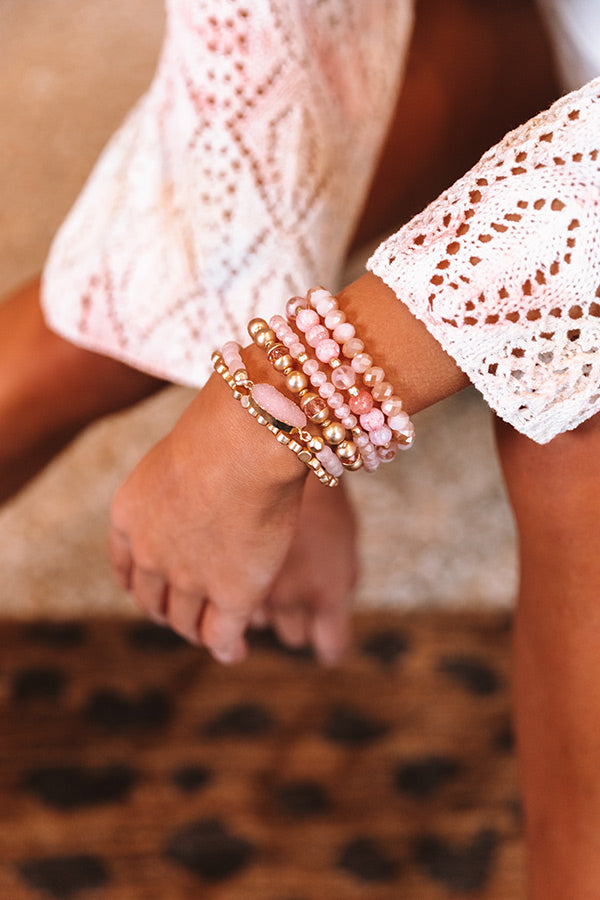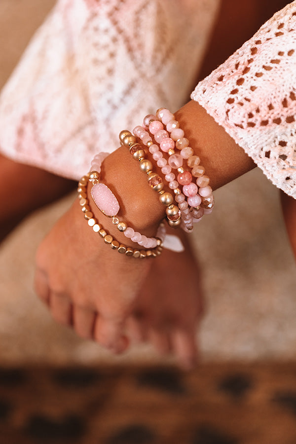 You jewelry style is sure to look beautiful when you accessorize with this adorable bracelet set featuring six pieces with rounded pink and gold beads and an elastic fit!