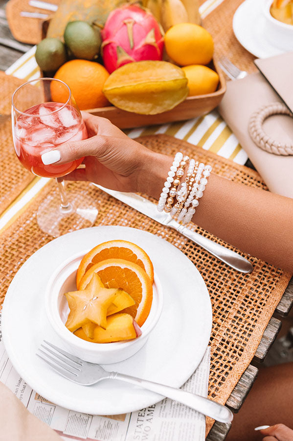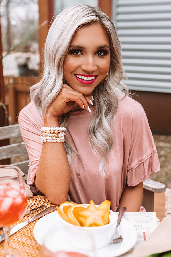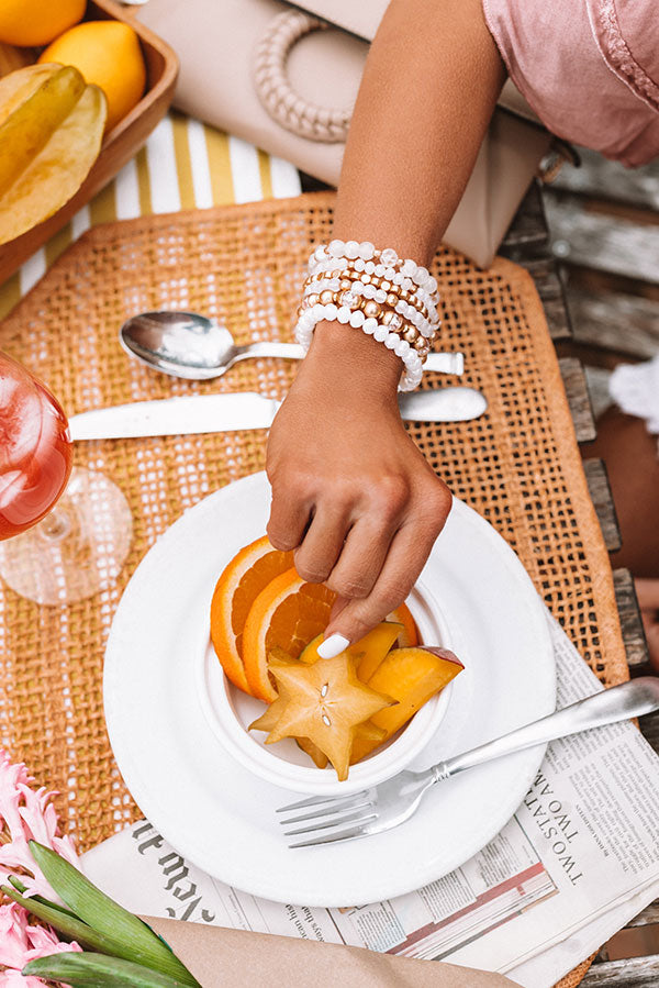 You jewelry style is sure to look beautiful when you accessorize with this adorable bracelet set featuring six pieces with rounded white and gold beads and an elastic fit!