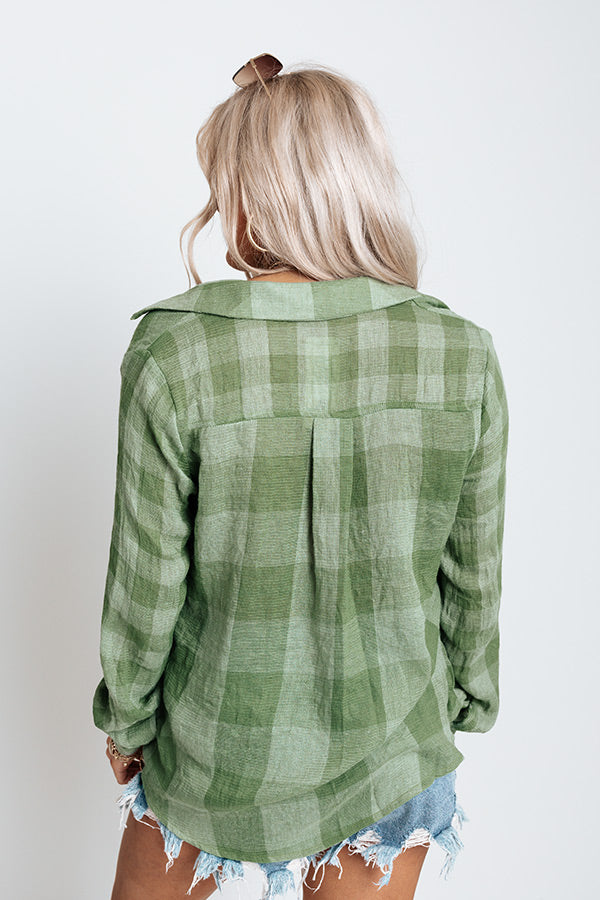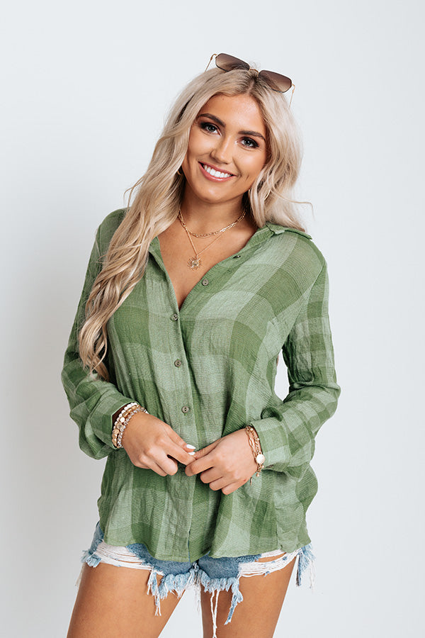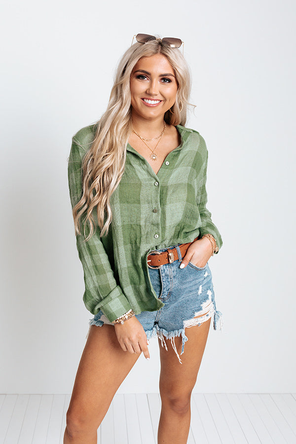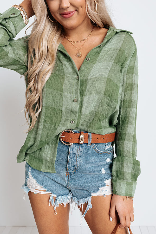 Transition from cold to warm weather effortlessly with our casual but cute 'Brooklyn Estate' top featuring lightweight material patterned with a green checkered print, a button down front with a collared neckline, long loose sleeves with fitted button closure cuffs, and a slouched silhouette that ends in a rounded hemline! Measurements