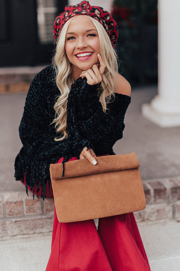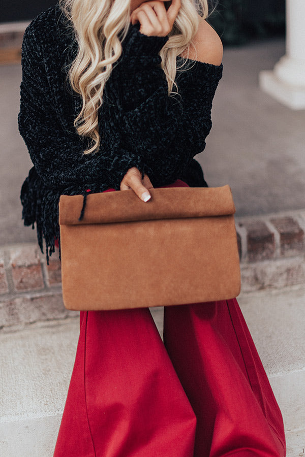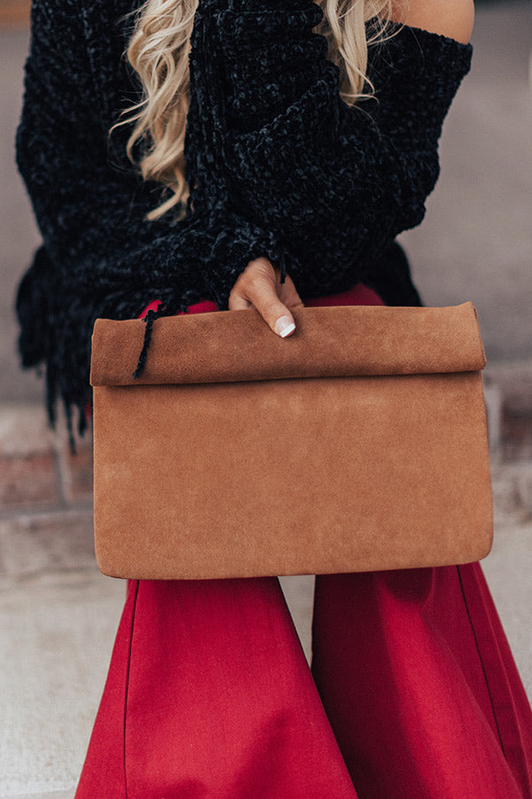 Show up to "Brooklyn happy hour" in style with this brown clutch featuring a soft faux suede material, a rolled flap with magnetic closure, and a fully lined spacious pouch with a zippered pocket!