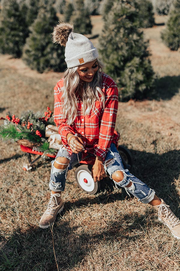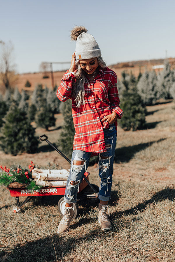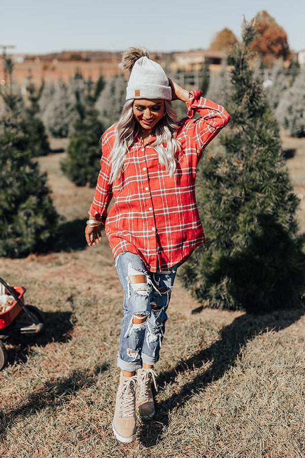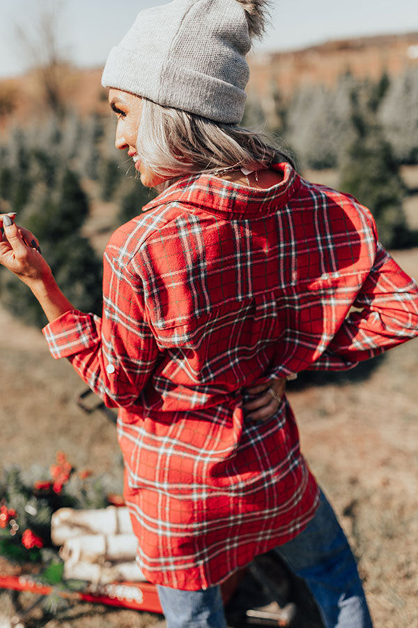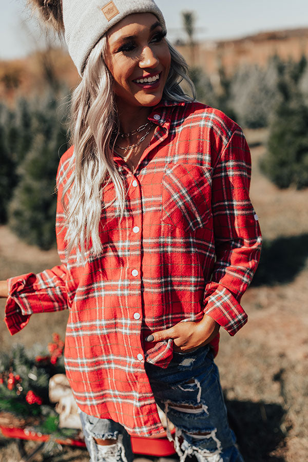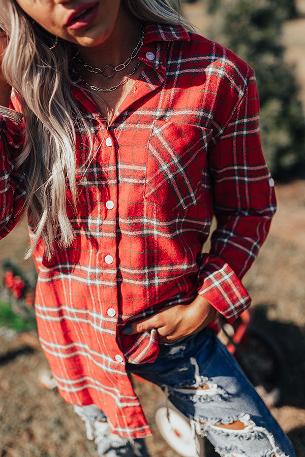Keep warm through the holiday season with our festive 'Brulee Babe' top featuring lightweight material patterned with a scarlet, black, and white flannel print, a button down front with a collared neckline, long loose sleeves with fitted button closure cuffs that can be rolled, accent chest pockets, and a relaxed silhouette that falls into a rounded hemline! Measurements