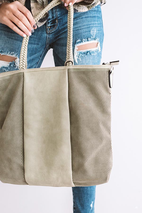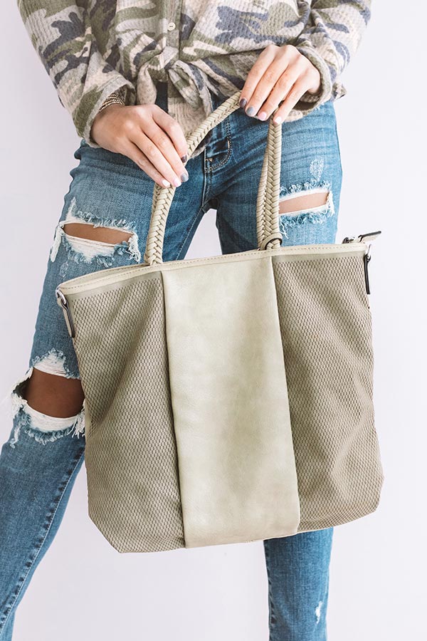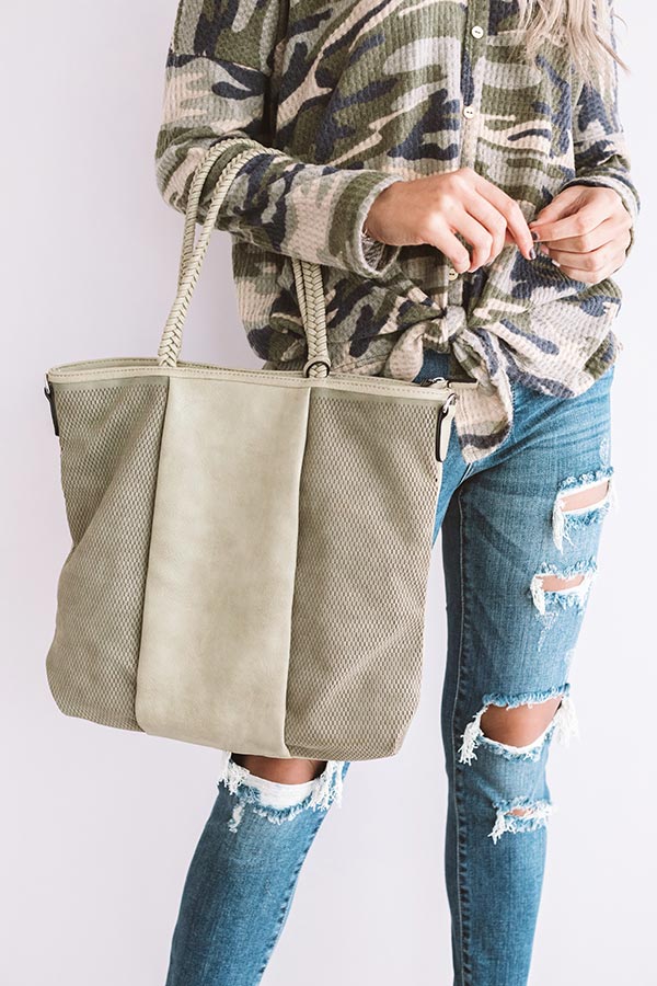 When headed for "brunch and bonding" there is no better accessory to show up in style with than this sage tote featuring faux leather material and subtle textured panels, two braided handles, a large fully lined pouch with a zip closure and multiple inner pockets, an accent key chain, and a removable and adjustable crossbody strap!